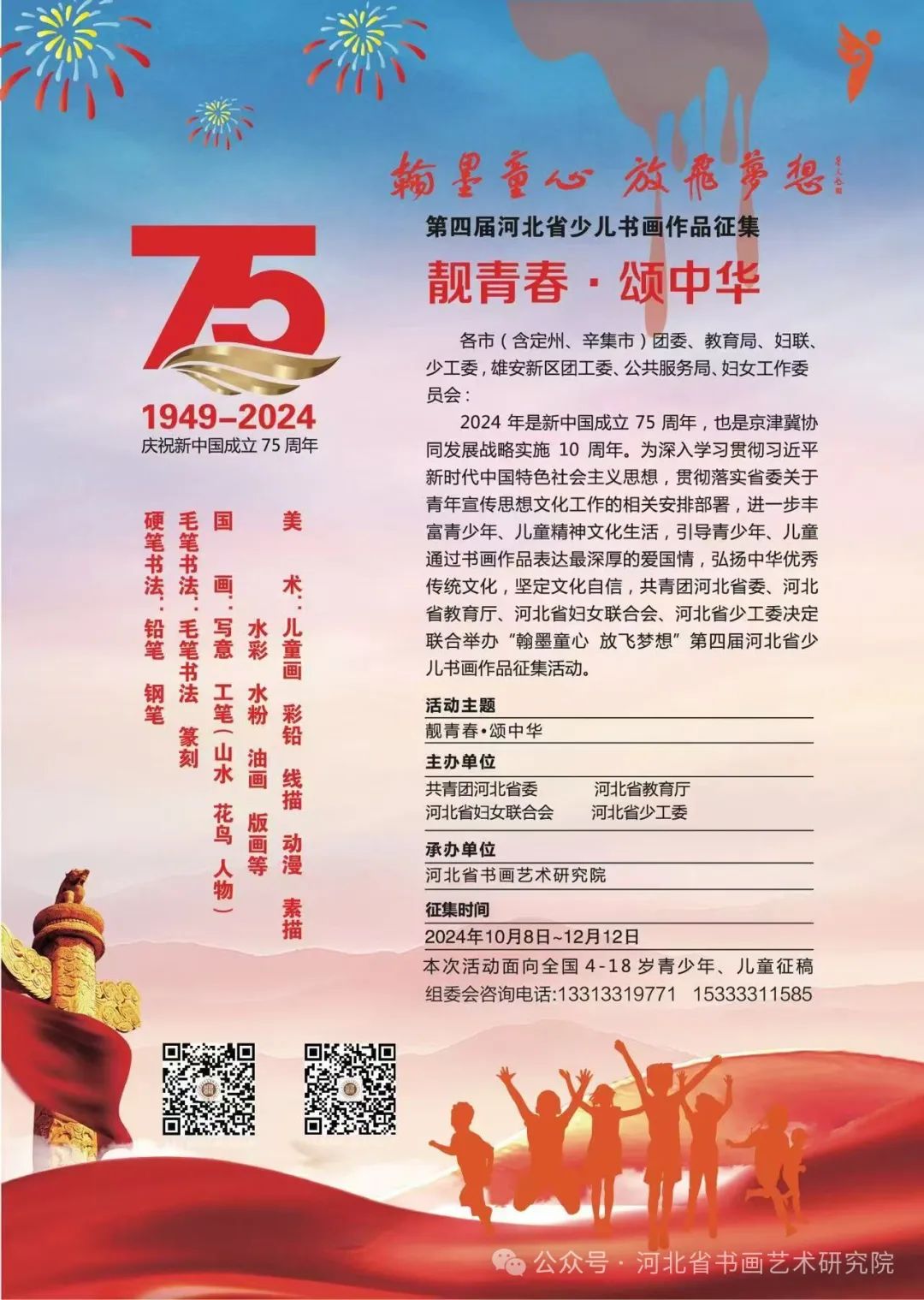 2024年是新中国成立75周年,是实现“十四五”规划目标任务的关键一年。为深入学习贯彻习近平新时代中国特色社会主义思想和党的二十大精神,贯彻落实省委省政府工作部署,加强新时代爱国主义教育,热情讴歌祖国发展成就,引领全省少年儿童弘扬优秀传统文化,坚定文化自信,通过书画作品表达最深厚的爱国情,传递对祖国最真挚的感恩与祝福。共青团河北省委、河北省教育厅、河北省妇女联合会、河北省少工委决定联合举办“翰墨童心 放飞梦想”第四届河北省少儿书画作品展征集活动。本次活动由河北省书画艺术研究院承办。