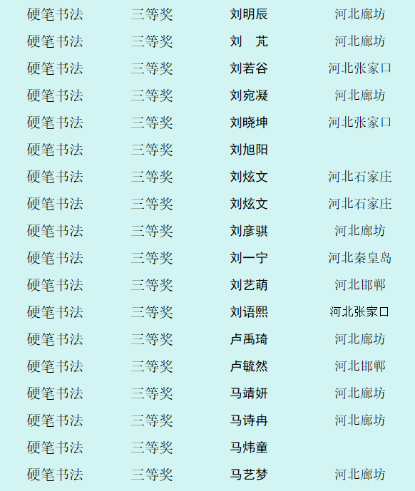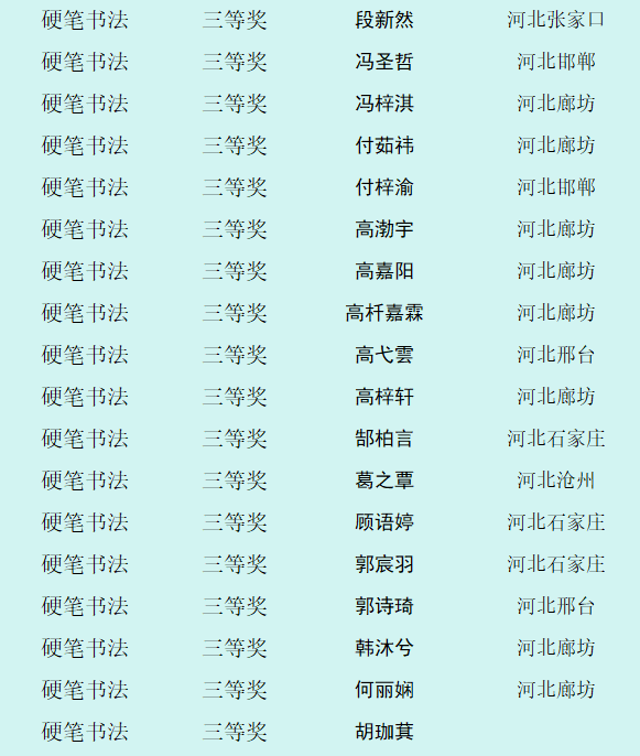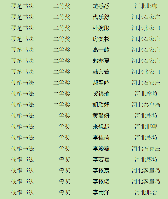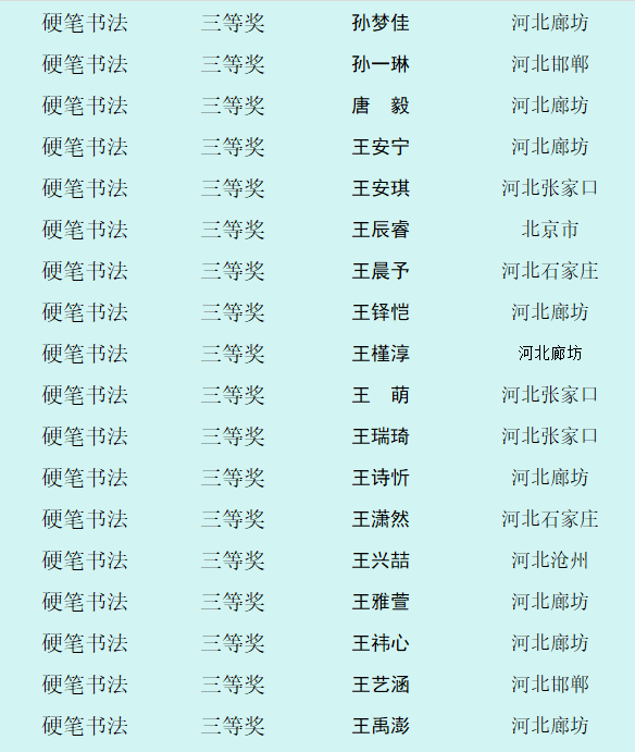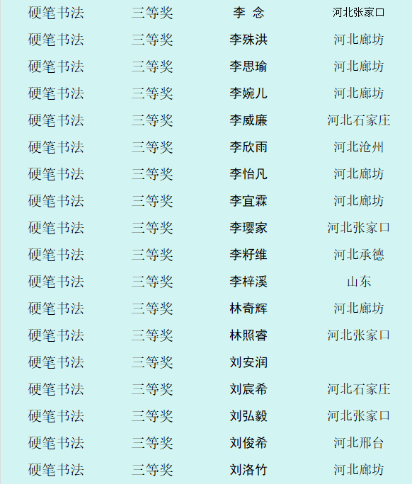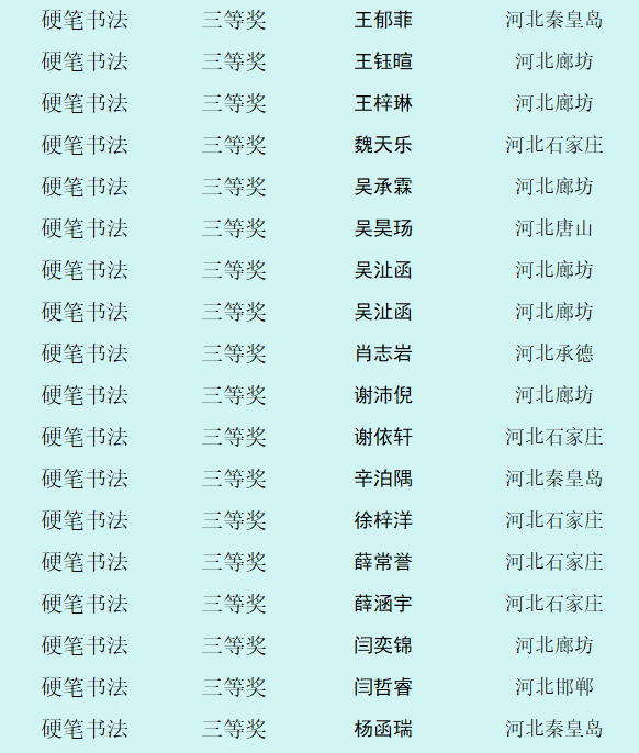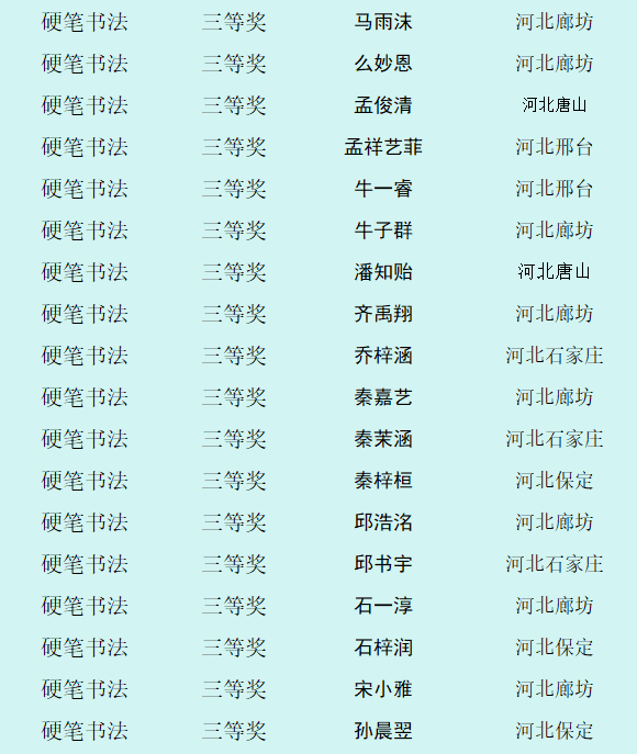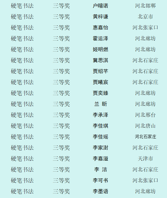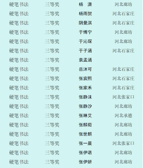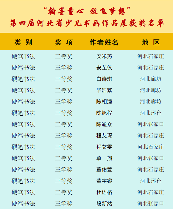 自10月8日征稿活动开启以来,活动受到全省乃至全国各地热爱书画艺术的少年儿童的积极参与。截止12月12日征稿结束,“翰墨童心 放飞梦想”第四届少儿书画展组委会共收到来自全国各地的投稿件数达60000余幅,经过组委会工作人员长达一个多月紧张忙碌的整理、评选、登记等工作,现已评选出硬笔书法组获奖作品,今天向社会公布幼儿组硬笔书法作品获奖作者名单。