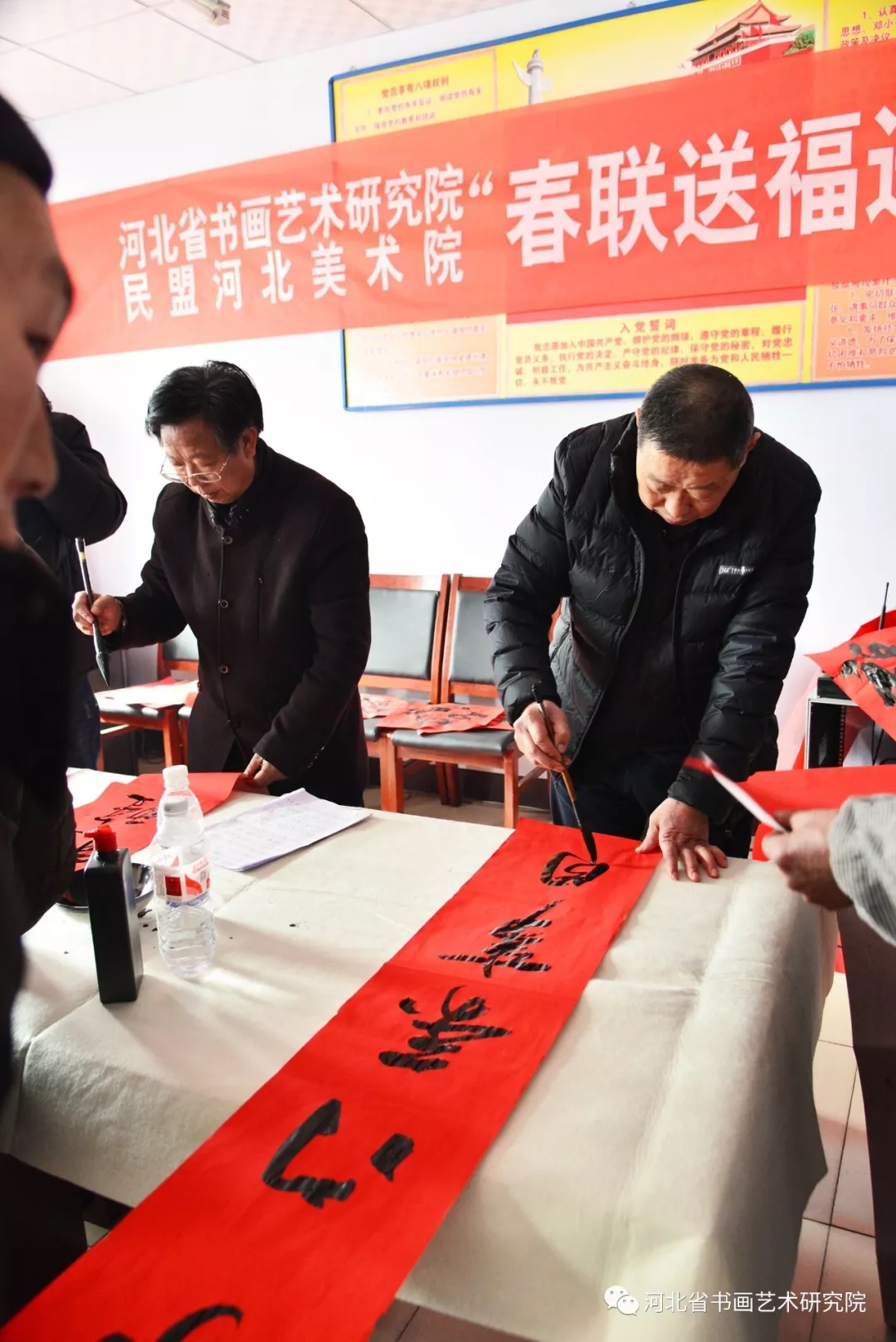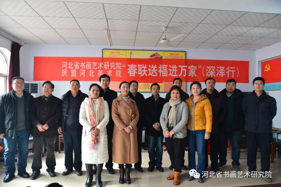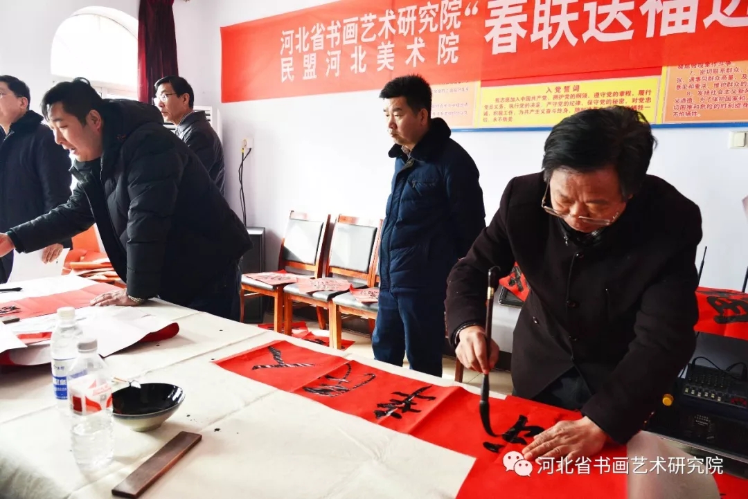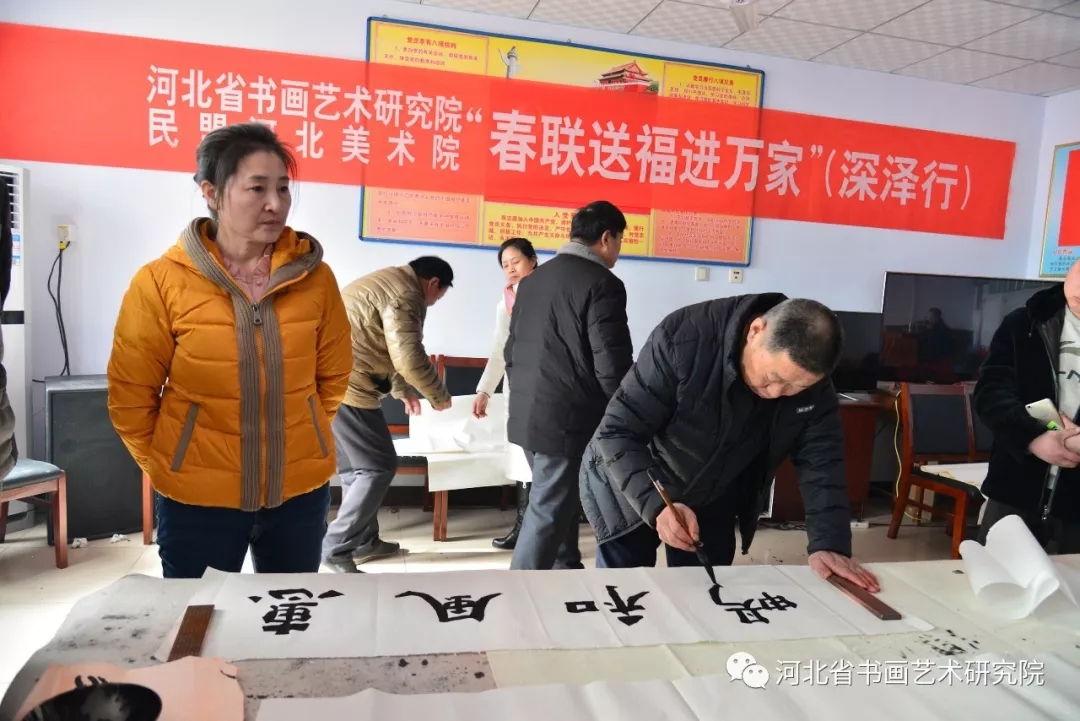 参加这次送文化下乡活动的有民盟中央美术院河北分院副秘书长、民盟省委宣传部副部长李运明,民盟中央美术院河北分的副秘书长、河北省书画艺术研究院院长赵岩峰,中国书法家协会会员、副院长、河北省书法家协会学术委员会副主任、石家庄市书法家协会副主席黄宪律,中国书法家协会会员、副院长、河北省书法家协会理事、楷书委员会副主任、辛集市书法家协会主席宗建业,副秘书长王世成,研究员赵雷,民盟河北美术院理事刘永芳等书法家。李运明部长和赵岩峰院长分别致辞,表达对深泽父老乡亲的新年祝福。乡亲们排队等候书法家老师给自己书写如意的春联和福字,红红火火过大年!为了满足每位乡亲的愿望,活动一直持续到下午一点多,撰写春联近千幅。这次写春联送福活动得到了深泽县领导和群众的感谢和热烈的欢迎!