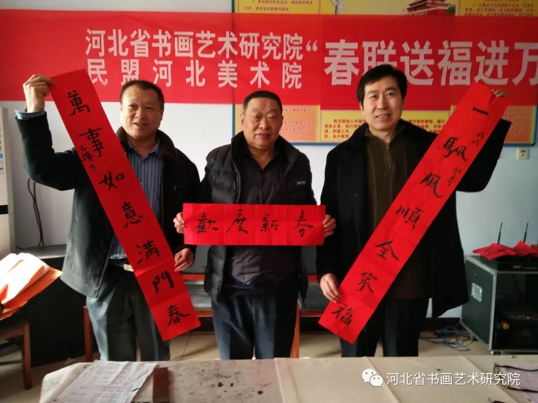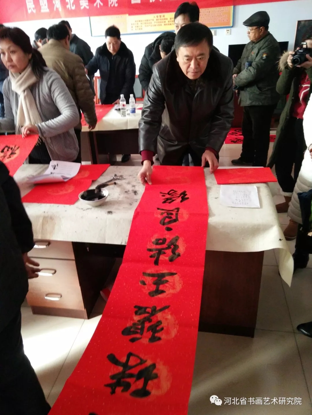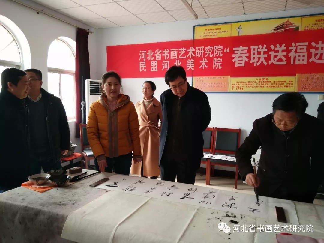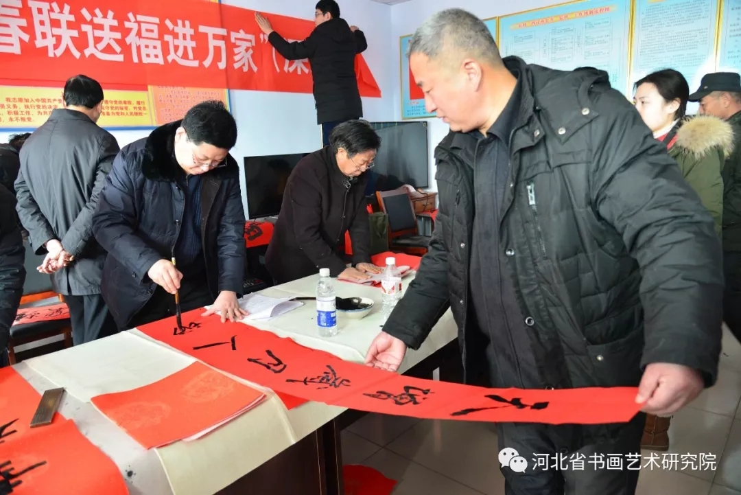参加这次送文化下乡活动的有民盟中央美术院河北分院副秘书长、民盟省委宣传部副部长李运明,民盟中央美术院河北分的副秘书长、河北省书画艺术研究院院长赵岩峰,中国书法家协会会员、副院长、河北省书法家协会学术委员会副主任、石家庄市书法家协会副主席黄宪律,中国书法家协会会员、副院长、河北省书法家协会理事、楷书委员会副主任、辛集市书法家协会主席宗建业,副秘书长王世成,研究员赵雷,民盟河北美术院理事刘永芳等书法家。李运明部长和赵岩峰院长分别致辞,表达对深泽父老乡亲的新年祝福。乡亲们排队等候书法家老师给自己书写如意的春联和福字,红红火火过大年!为了满足每位乡亲的愿望,活动一直持续到下午一点多,撰写春联近千幅。这次写春联送福活动得到了深泽县领导和群众的感谢和热烈的欢迎!