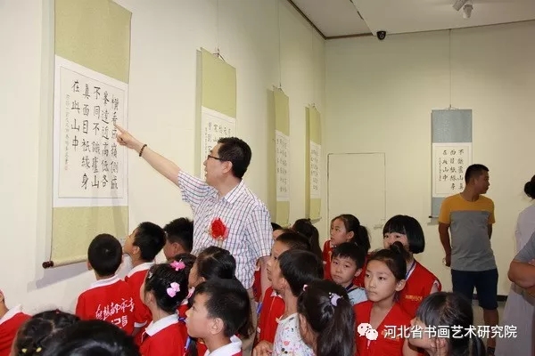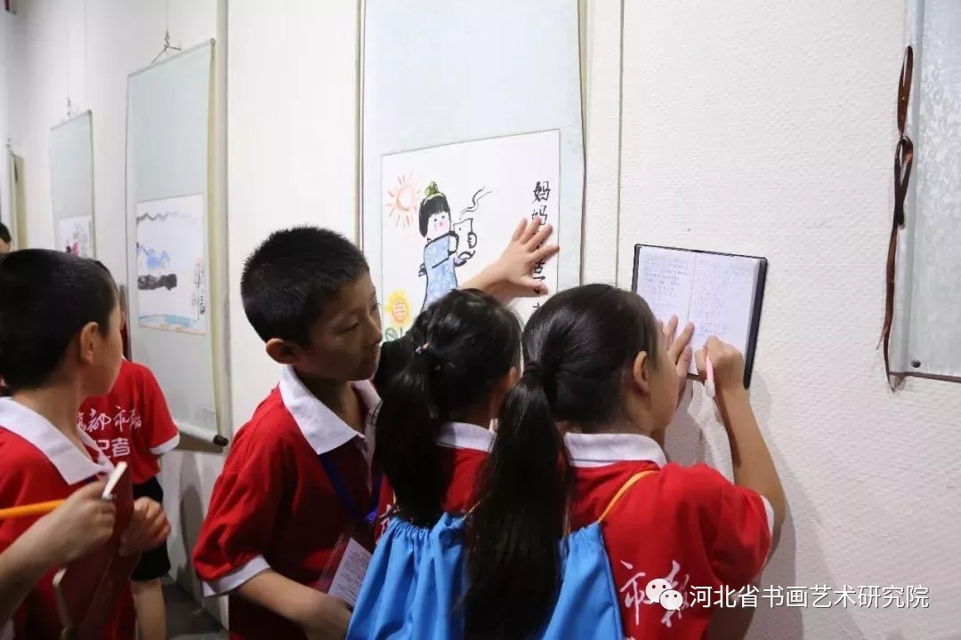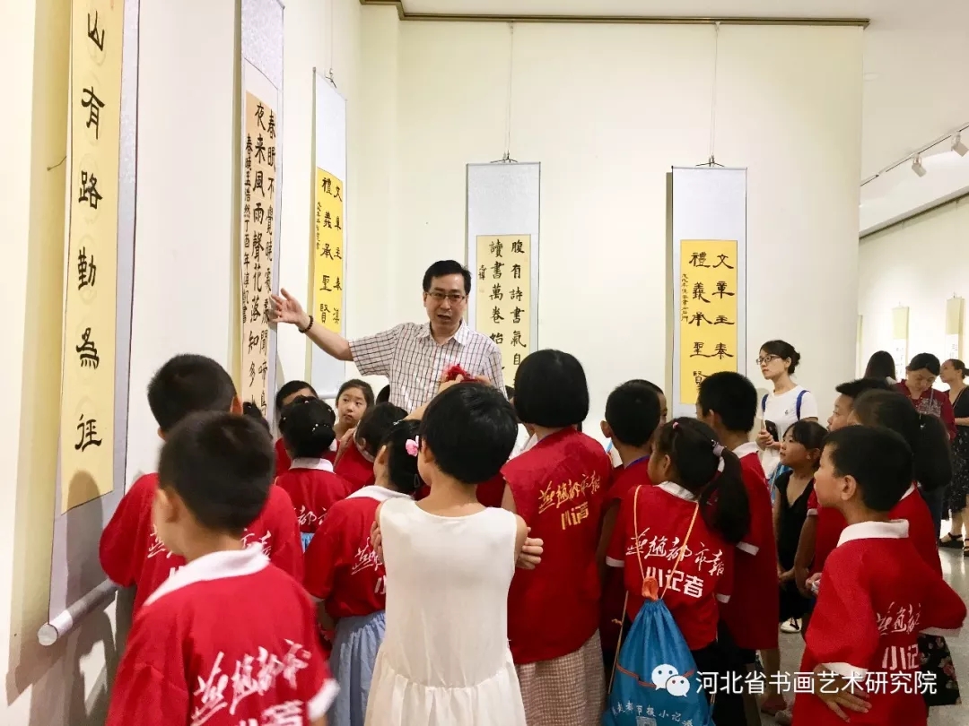 随后,院长赵岩峰接受了石家庄广播电视台及燕赵都市报的采访并和研究员赵晓兵为燕赵都市报小记者与参加展览的小朋友们讲解了作品优点及不足之处,并对以后选手们的书画参展提供了参考。