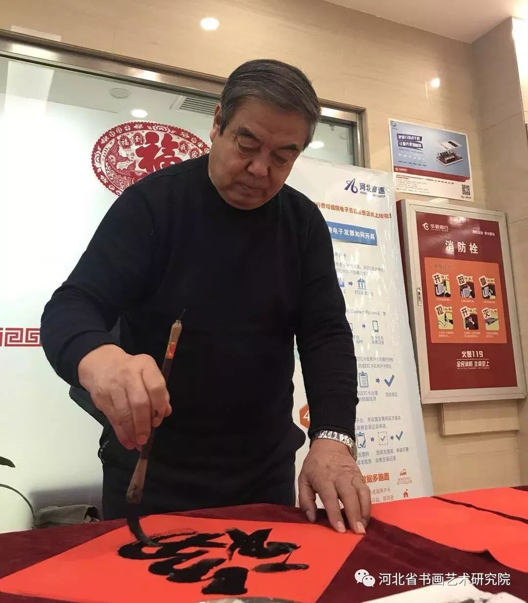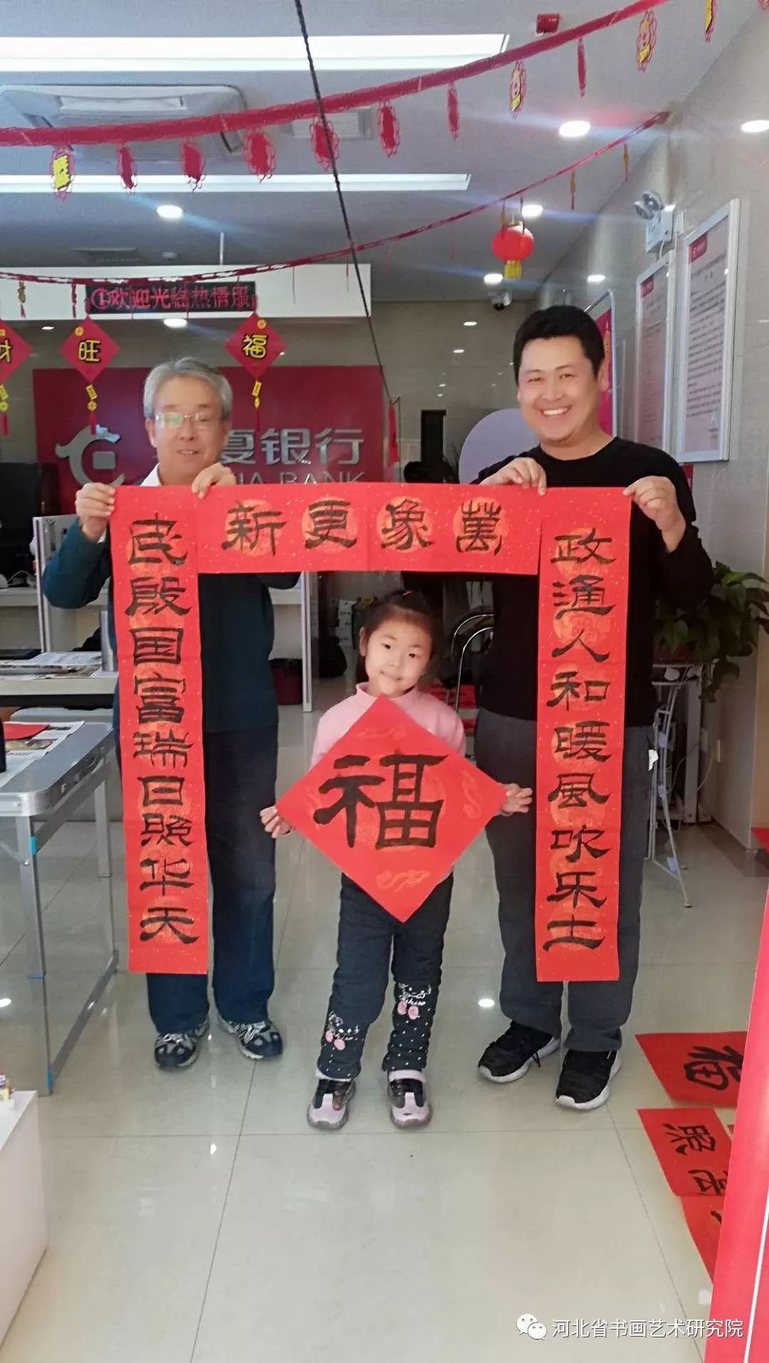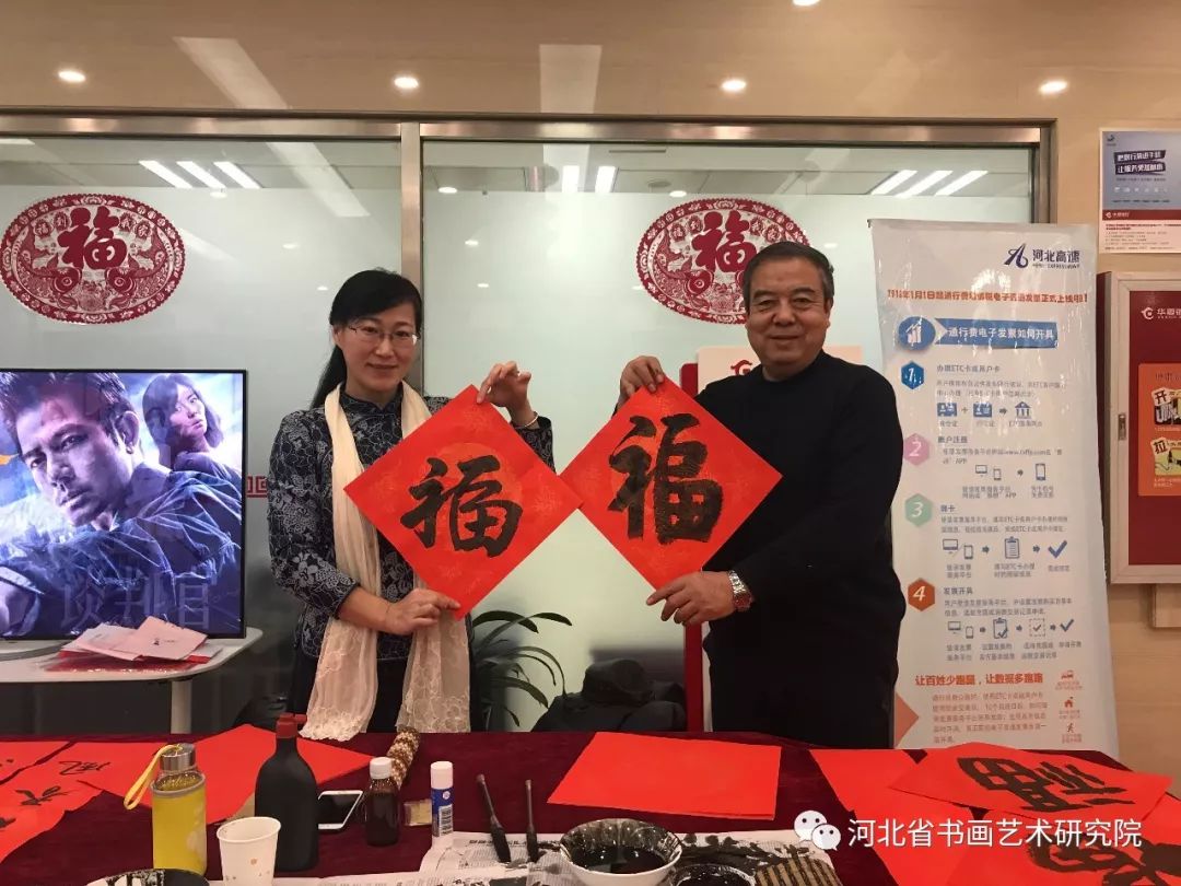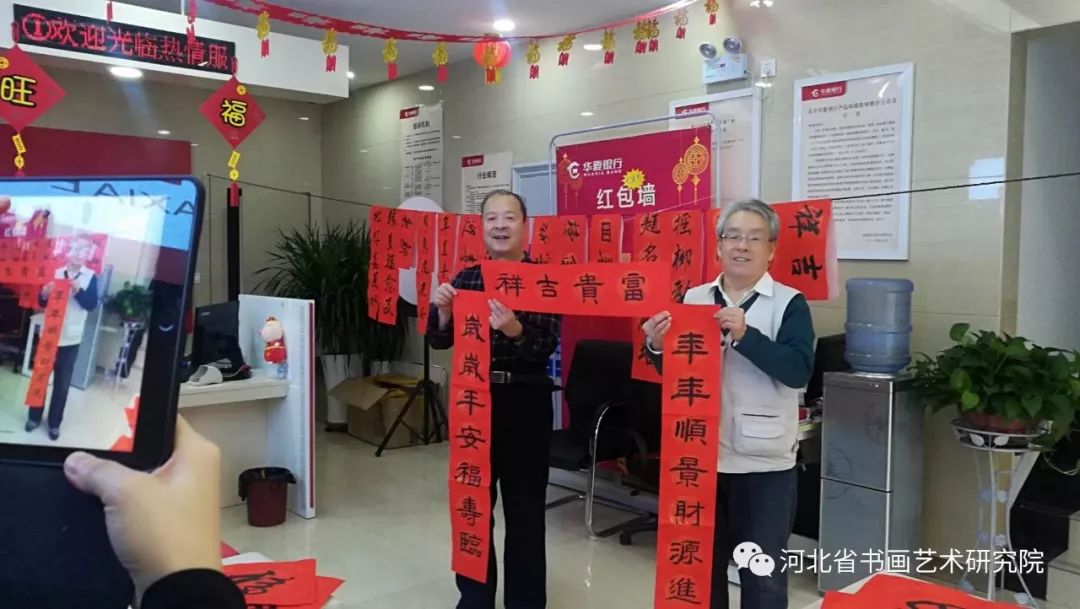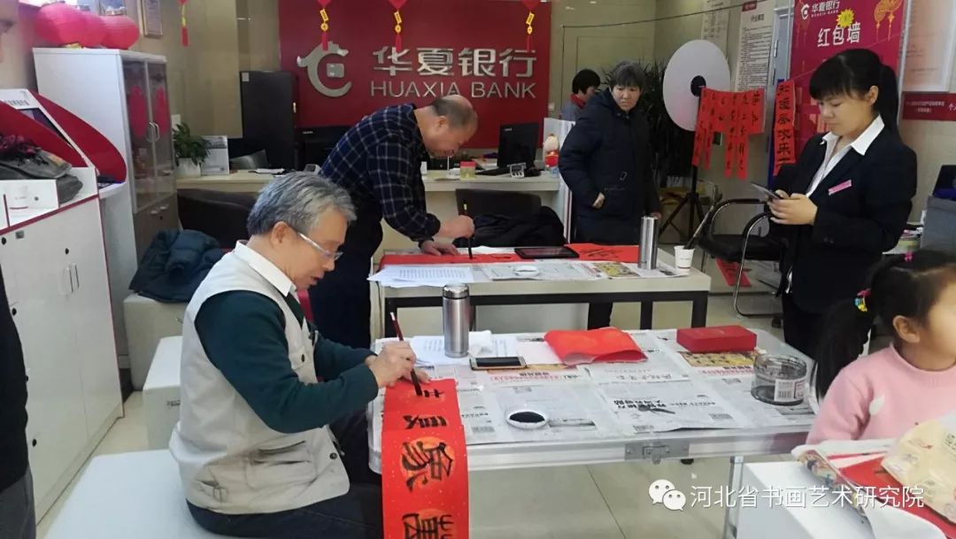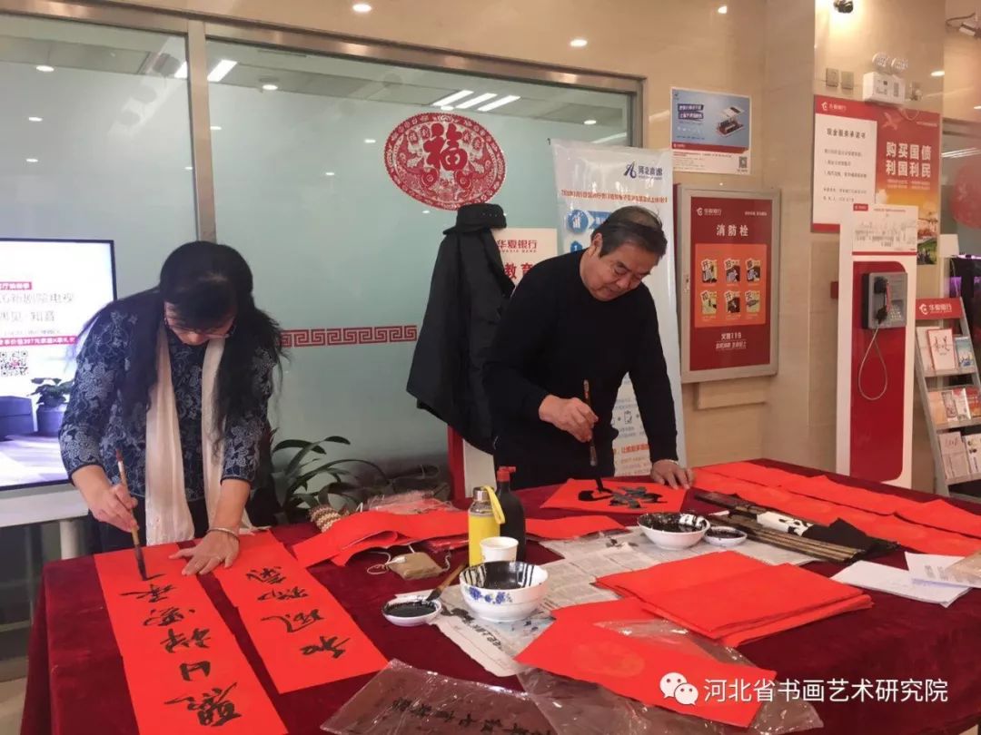 2019年1月17日下午,河北省书画艺术研究院理事梁山、张继胜,研究员张建刚、翁显梅等书画家受《燕赵老年报》特邀,分两组分别到华夏银行高新区支行、华夏银行同祥城社区支行,为银行员工和客户义写春联送福活动,受到了广大群众热烈欢迎和好评。