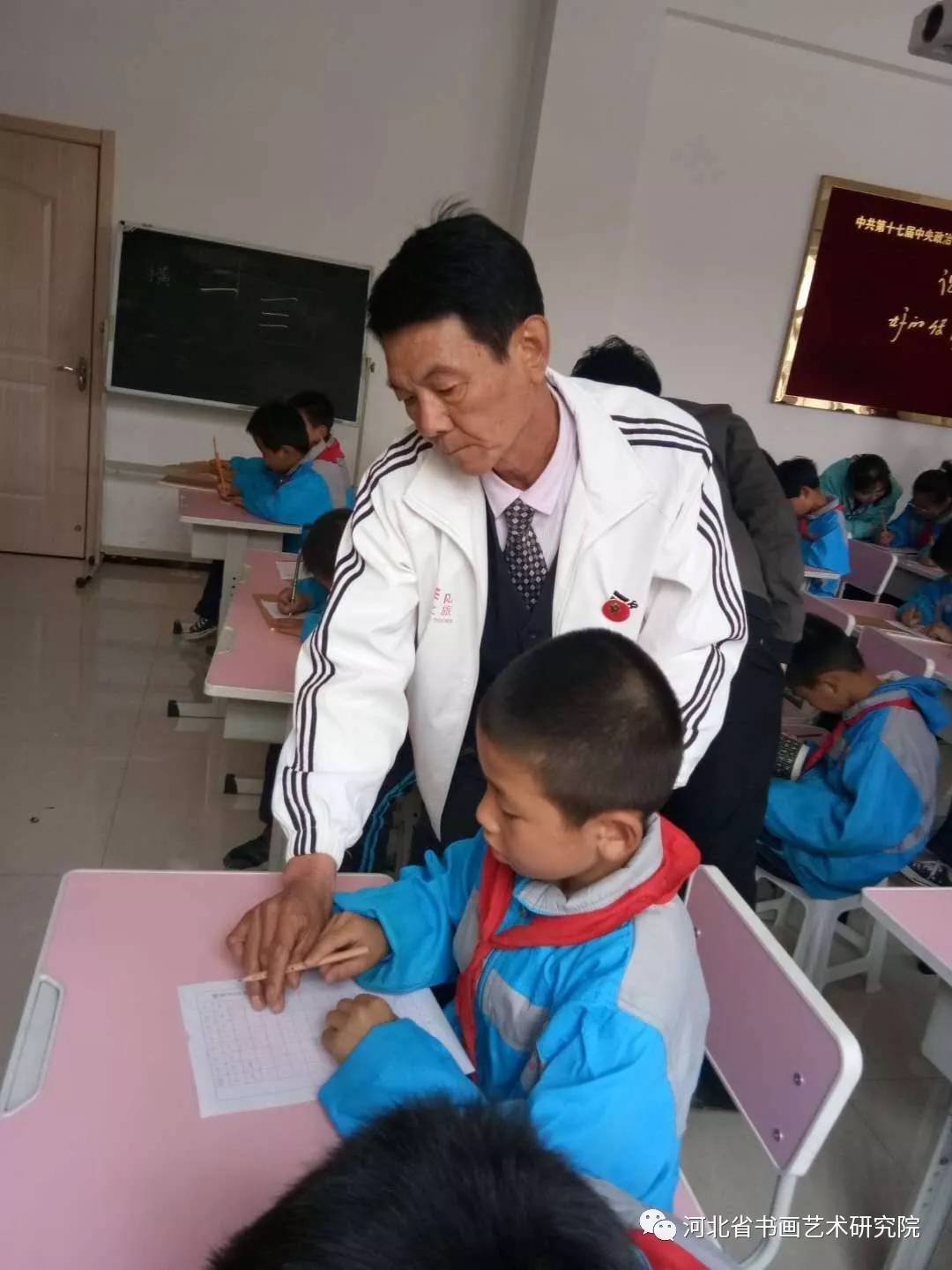 后,书画研究院的成员们进行了一场丰富多彩的艺术普及知识讲座。研究院理事赵晓兵老师讲解了硬笔书法的基本握笔姿势以及字形规范;研究员郑少东老师讲解了国画花卉的基本画法;研究员宋计生老师讲解了毛笔书法的基本握笔姿势及书写,并带去了字帖让孩子们进行欣赏学习;研究员、曾经的海军军旅书法家魏铁刚,为孩子们用口琴吹奏了优美欢快地儿歌歌曲。