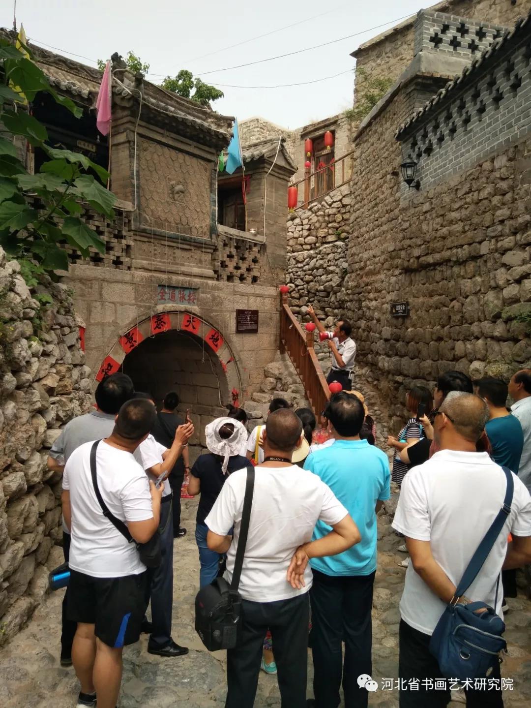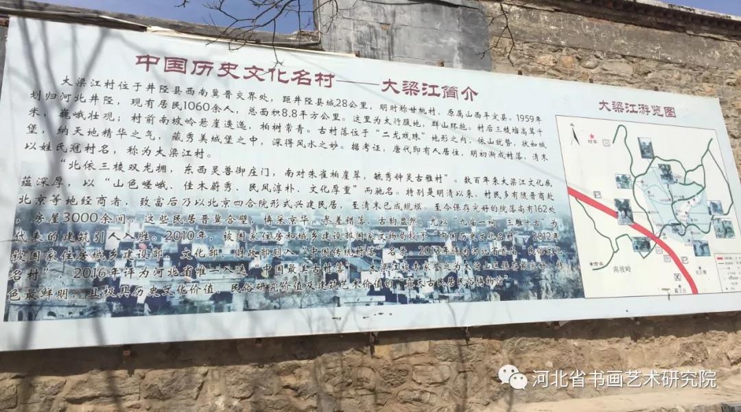 揭牌仪式结束后,大梁江村金牌导游梁老师带领书画家们参观游览了古村落景区。导游梁老师知识渊博、讲解精彩,大家被大梁江深厚的文化底蕴所感染,学习了解了元明清历史知识和古建筑文化,纷纷表示大梁江如此美丽不虚此行。河北井陉县大梁江于2010年12月13日成功入选中国历史文化名村(名镇)。大梁江始建于元末明初,位于井陉县西部,因其隐藏在群山环抱之中,古风古貌得以完整保存下来,向人们展示着一代晋商曾经的辉煌,人们称之为河北的“乔家大院”。