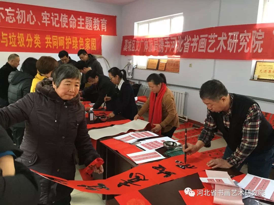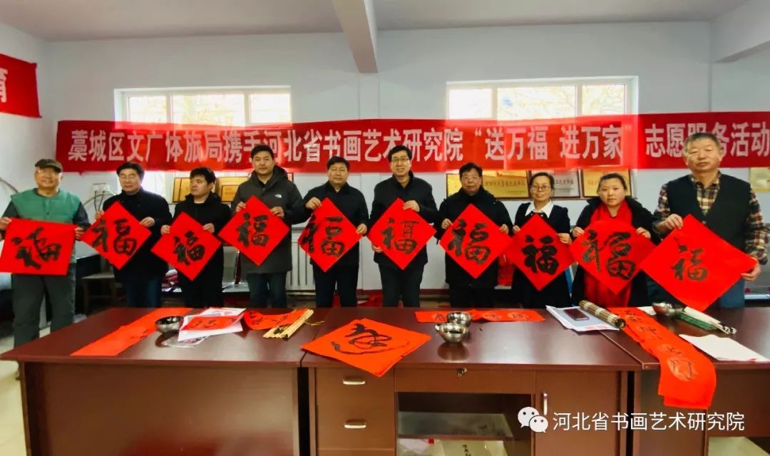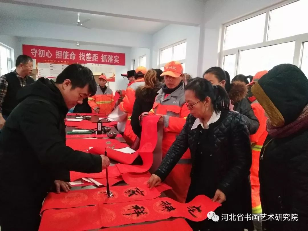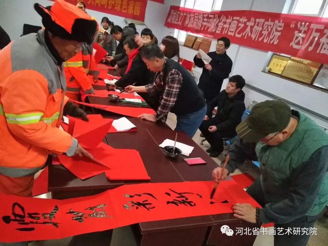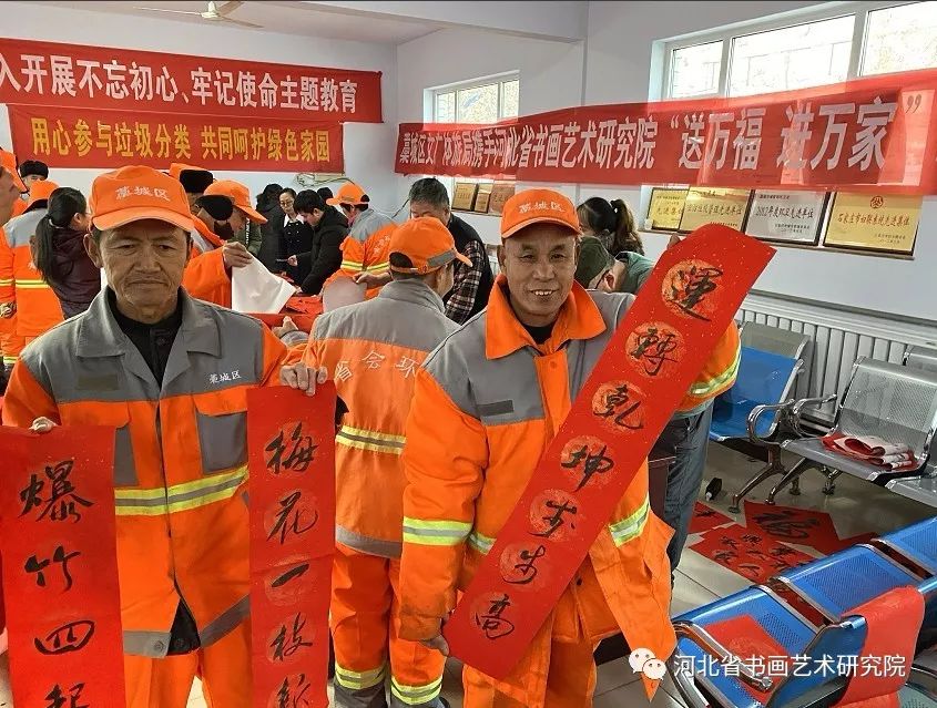 2020年1月19日下午,石家庄市藁城区文广体旅局携手河北省书画艺术研究院“送万福进万家”志愿服务活动走进藁城区住建局为环卫工人写春联送祝福。参加这次活动的艺术家有河北省书画艺术研究院院长赵岩峰、副院长黄宪律、常务理事田江水、办公室主任陈素敏、研究员路永兵、徐惠生、郭建刚、李振华、书法家王辉(河北地质大学土地学院副书记)、藁城区书协副主席李建强、书法家杨彦芬等。
