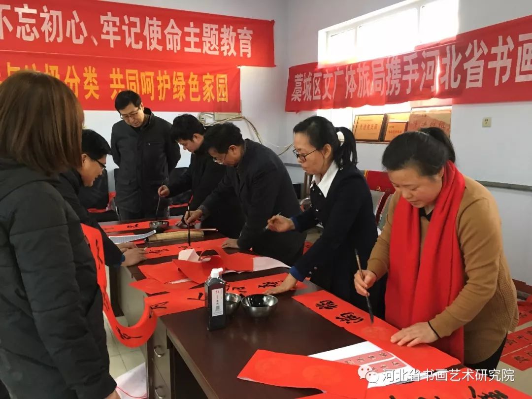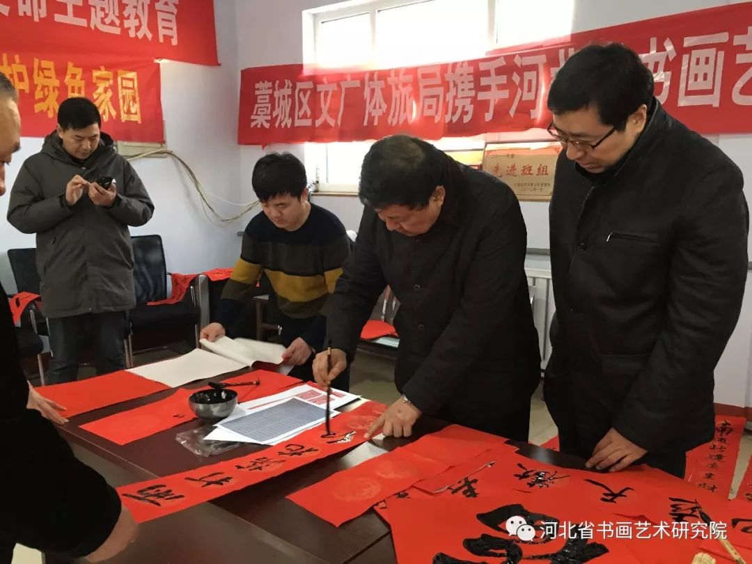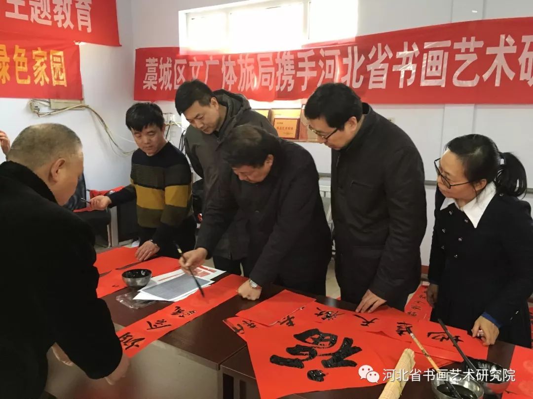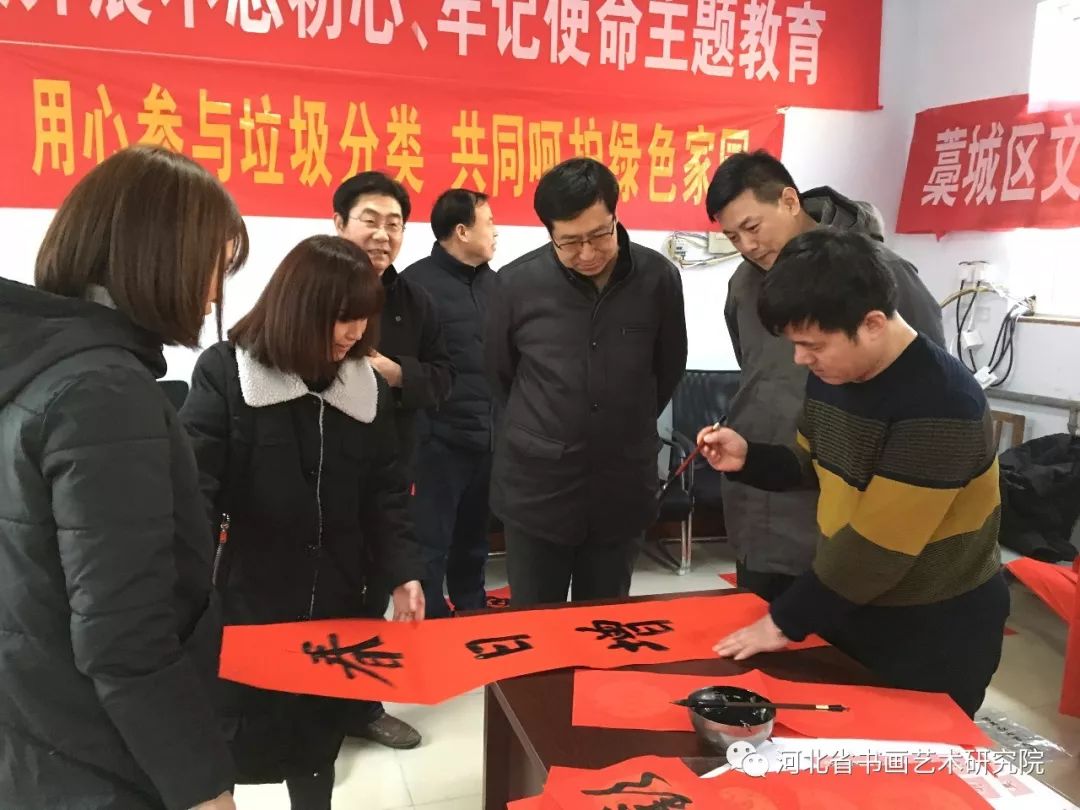 2020年1月19日下午,石家庄市藁城区文广体旅局携手河北省书画艺术研究院“送万福进万家”志愿服务活动走进藁城区住建局为环卫工人写春联送祝福。参加这次活动的艺术家有河北省书画艺术研究院院长赵岩峰、副院长黄宪律、常务理事田江水、办公室主任陈素敏、研究员路永兵、徐惠生、郭建刚、李振华、书法家王辉(河北地质大学土地学院副书记)、藁城区书协副主席李建强、书法家杨彦芬等。