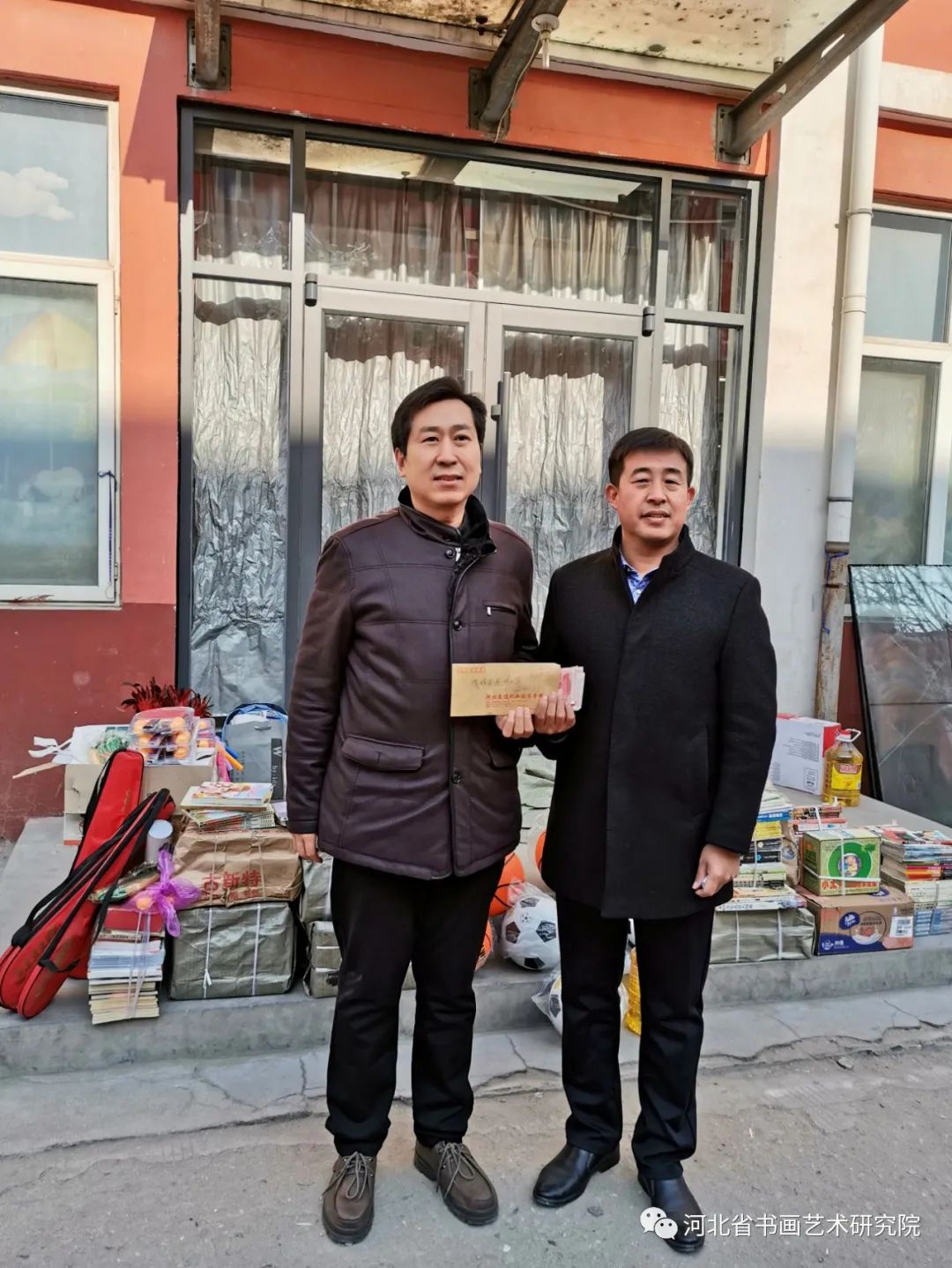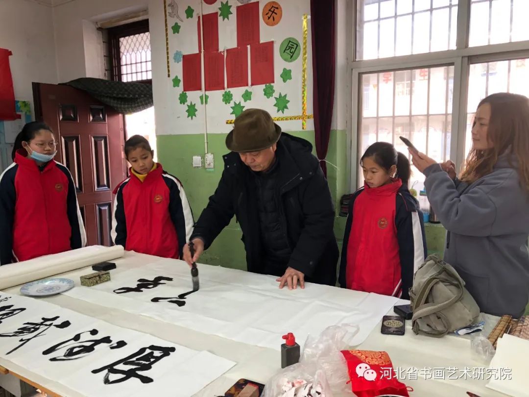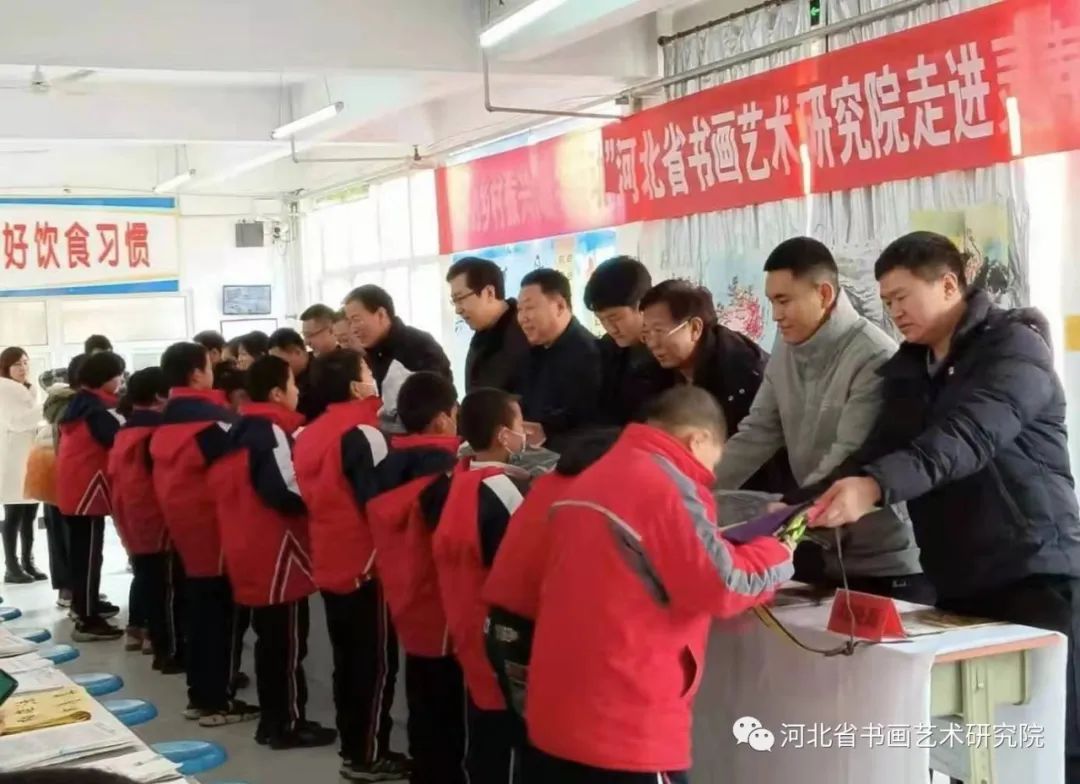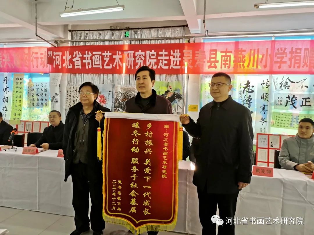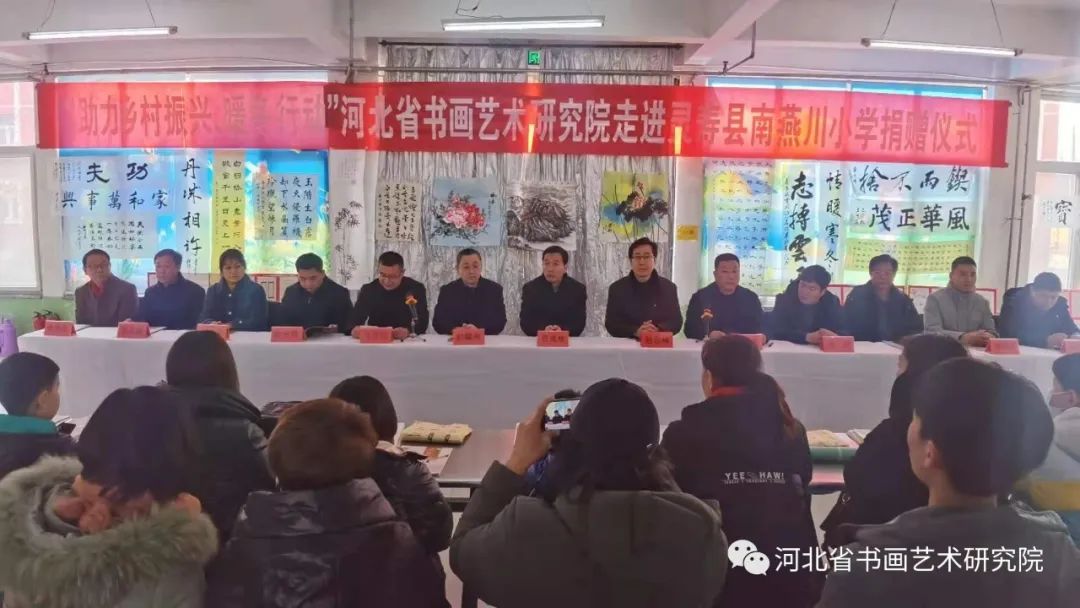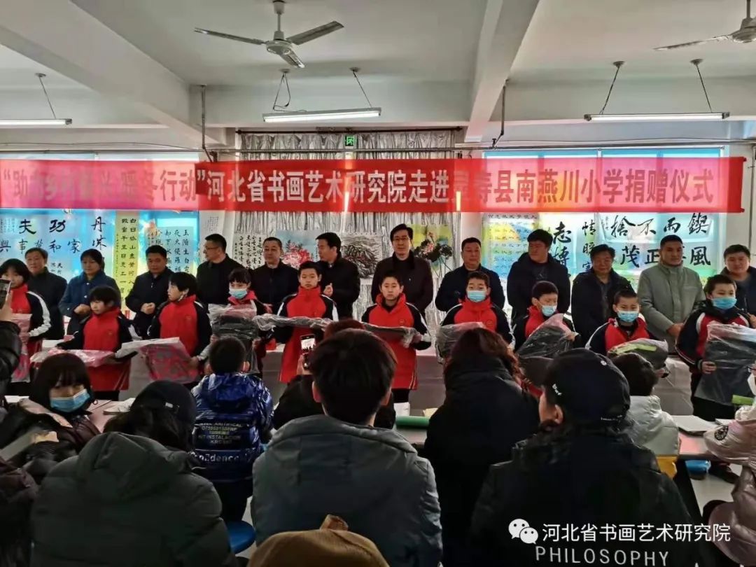 这次爱心捐赠活动是由河北省书画艺术研究院发起,灵寿县委宣传部、灵寿县文联、灵寿县教育局单位承办的一次爱心捐赠活动。上午10:30捐赠仪式正式开始。参加捐赠仪式的有灵寿县委常委、宣传部部长贾兆雄,县委宣传部常务副部长赵耀洲,县文联主席徐东亮,县委教育工委副书记马仲波,县委宣传部国教办主任侯书明,县书法家协会主席李周彦,燕川乡副乡长马烈,燕川学区书记杨志波,南燕川小学校长刘建昆,南燕川村支部书记刘晓磊。河北省书画艺术研究院院长赵岩峰,副院长黄宪律,常务理事梁山,理事王辉、石教民、聂江涛、张文生,研究员魏铁刚、翁显梅、路素芳、马建国、杨海峰、刘子军、郭道寅、李和平、王志强、闫朋朋、光冰冰、孙玉,办公室陈素敏、刘娟、范东霞,正定全优教育、鹿泉小蚂蚁画室、泰康养老、同方全球人寿等单位及社会各界的爱心人士60多人,灵寿县南燕川小学师生代表20余人。