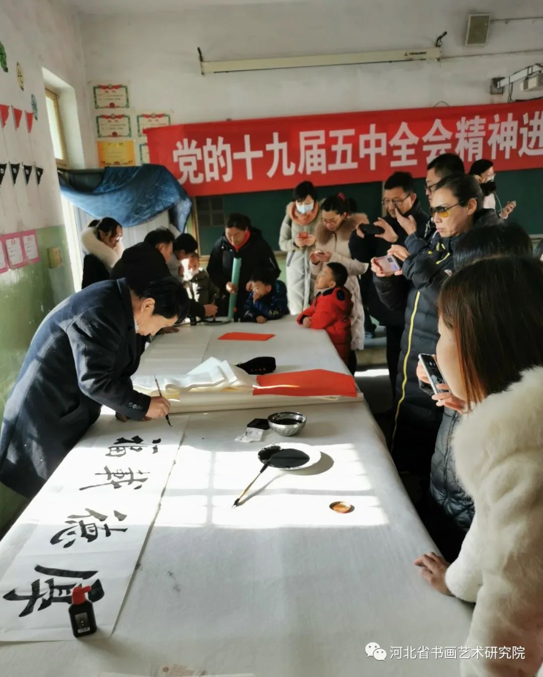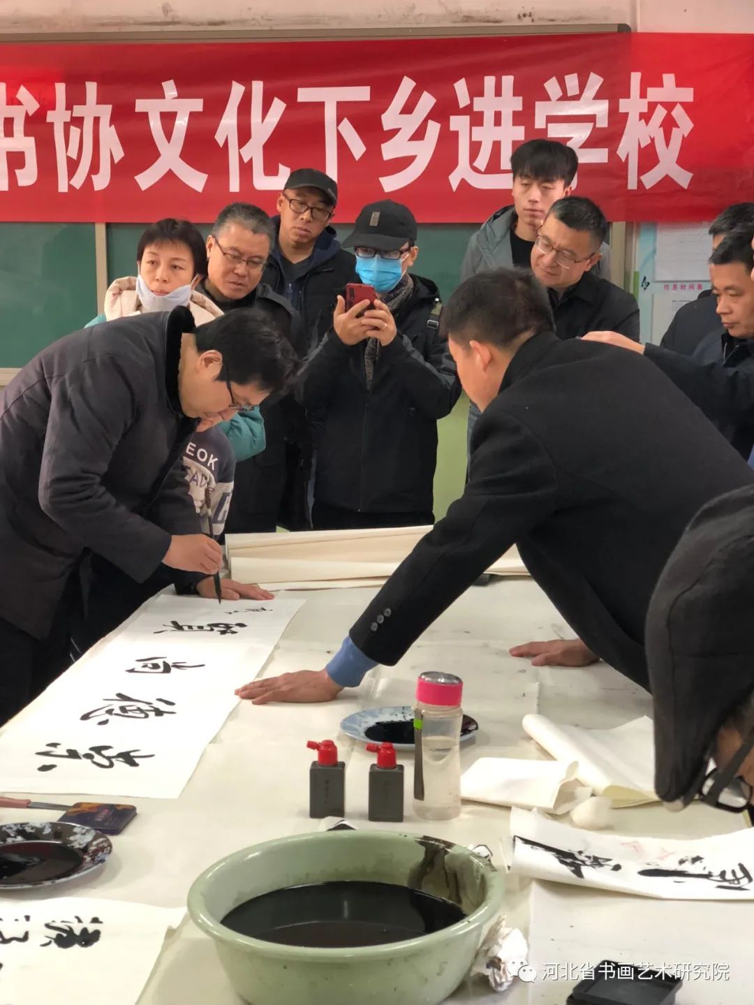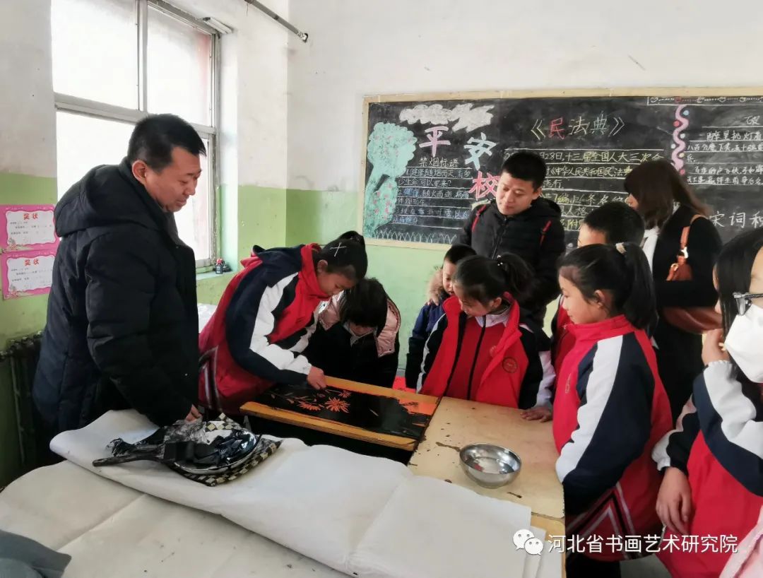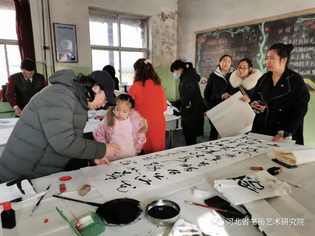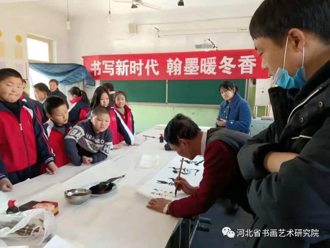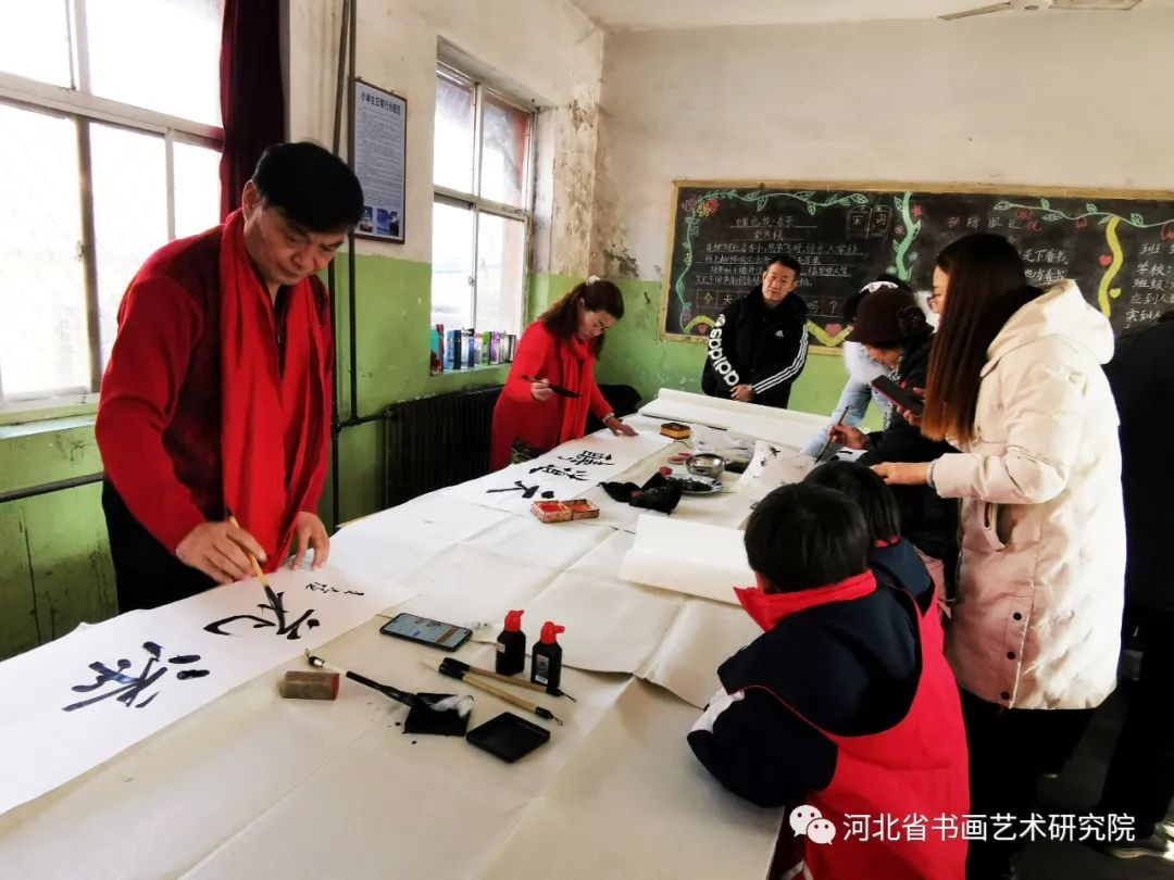 慰问困难家庭返回后,书画家们挥毫泼墨进行了书画创作笔会,教给孩子们欣赏书画作品,受到了学校师生和现场参加活动人员的热烈欢迎,大家排着队都想求得一幅书画名家的作品。