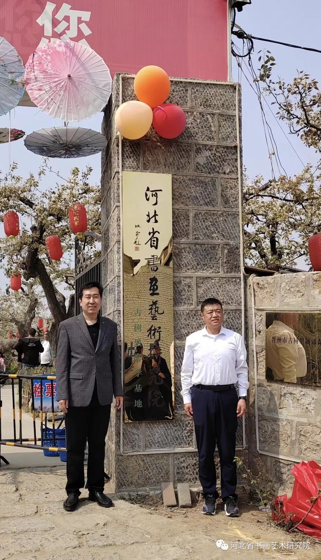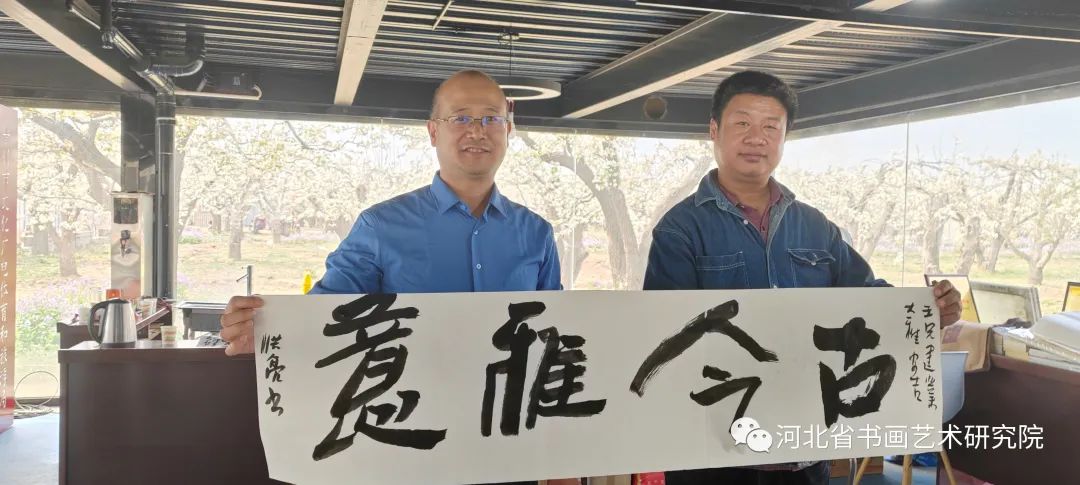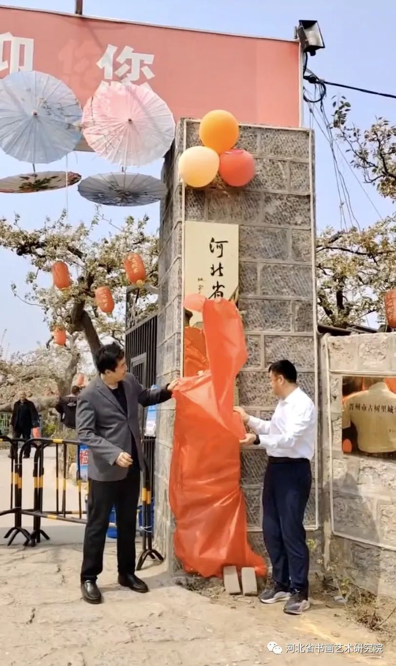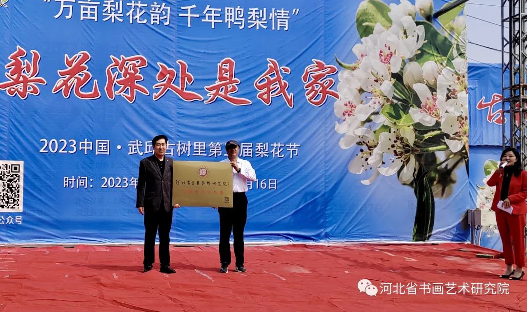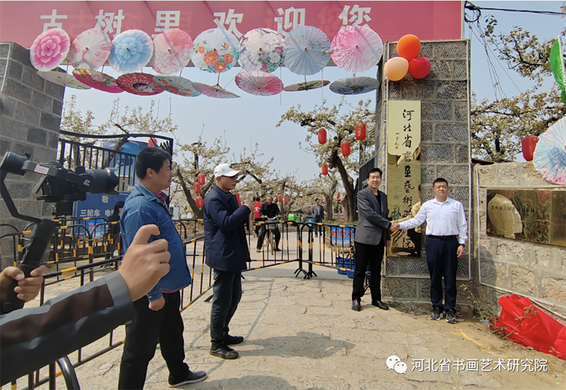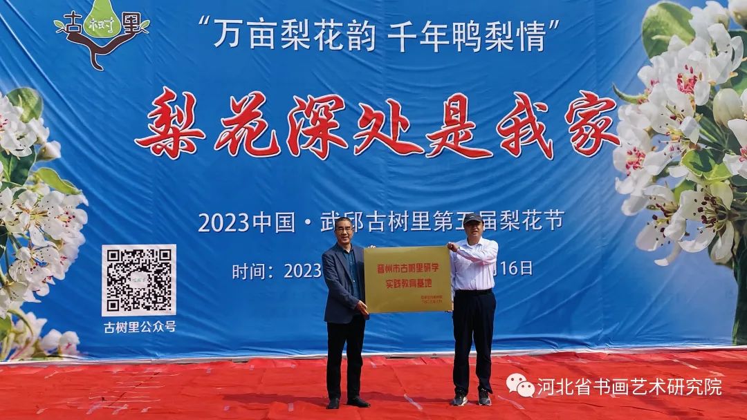 上午九点,河北省书画艺术研究院赵岩峰院长一行来到晋州市武邱古树里梨园,授予古树里梨园为“河北省书画艺术研究院古树里游学基地”。河北省书画艺术研究院院长赵岩峰与河北冀宝盆农业开发有限公司刘亚辉总经理一起为河北省书画艺术研究院古树里游学基地进行了揭牌。