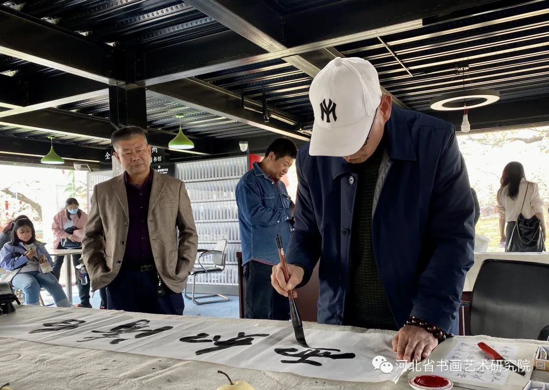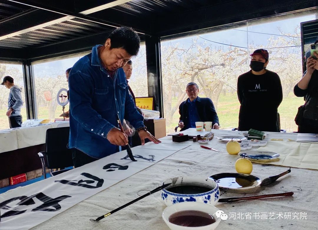 揭牌仪式结束后,为助力梨花节开幕式及河北省书画艺术研究院古树里游学基地的成立,研究院的书画家在景区开展了现场笔会。书画家们挥毫泼墨,现场题字作画,一提一落,以字传情,以画达意。作品内容丰富,形式或刚劲有力、或行云流水,吸引着围观的群众认真观摩,与书画家们现场切磋,交流经验,气氛异常热烈。这次笔会让古树里的游客近距离的接触到书画艺术,感受到了中国书画的魅力。