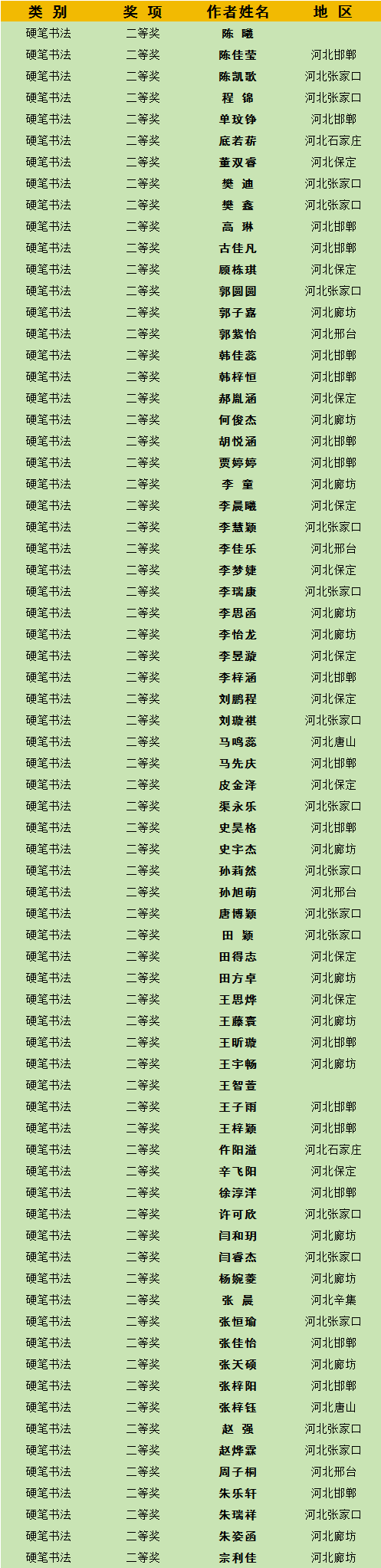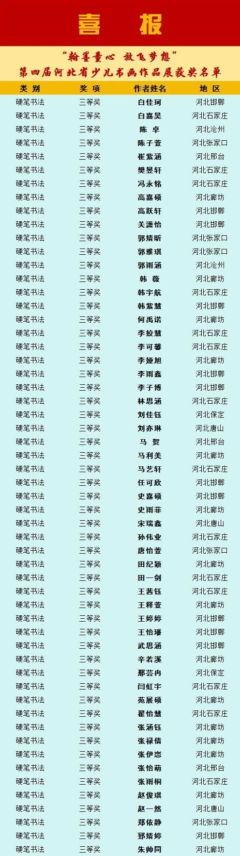 自10月8日征稿活动开启以来,活动受到全省乃至全国各地热爱书画艺术的少年儿童的积极参与。截止12月12日征稿结束,“翰墨童心 放飞梦想”第四届少儿书画展组委会共收到来自全国各地的投稿件数达60000余幅,经过组委会工作人员长达一个多月紧张忙碌的整理、评选、登记等工作,已评选出硬笔书法组获奖作品。前期已公布幼儿组与儿童组以及少年A组获奖名单,今日起向社会公布少年B组硬笔书法类作品各奖项获奖作者名单,至今日所有硬笔书法奖项已公布完毕,组委会免费提供电子版获奖证书,如有需要请于年后与组委会联系领取。