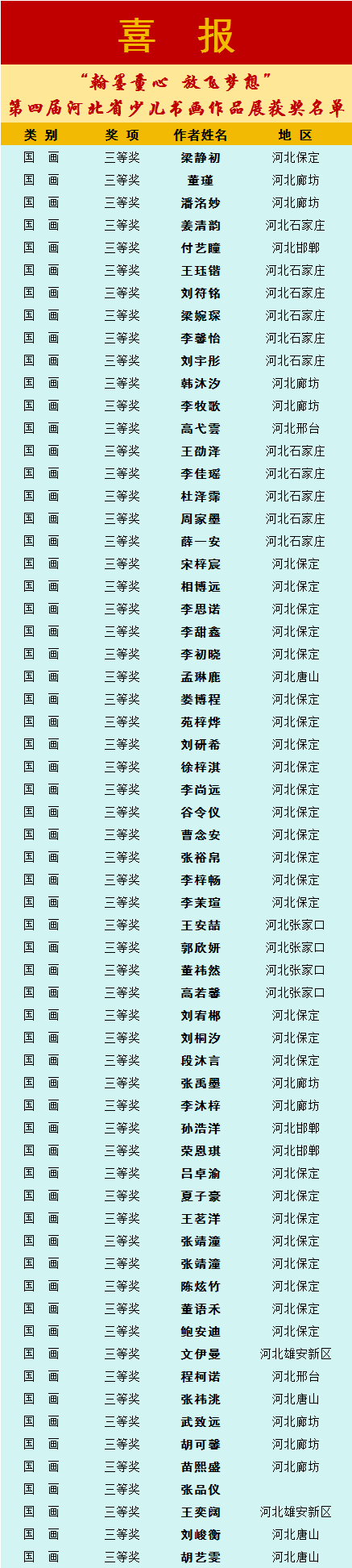 自10月8日征稿活动开启以来,活动受到全省乃至全国各地热爱书画艺术的少年儿童的积极参与。截止12月12日征稿结束,“翰墨童心 放飞梦想”第四届少儿书画展组委会共收到来自全国各地的投稿件数达60000余幅,经过组委会工作人员长达一个多月紧张忙碌的整理、评选、登记等工作,现评选出国画组获奖作品。今日起陆续向社会公布国画类作品各组别作者名单。
