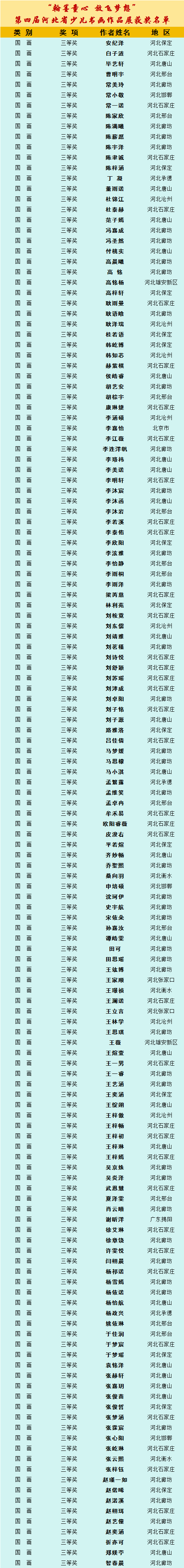 自10月8日征稿活动开启以来,活动受到全省乃至全国各地热爱书画艺术的少年儿童的积极参与。截止12月12日征稿结束,“翰墨童心 放飞梦想”第四届少儿书画展组委会共收到来自全国各地的投稿件数达60000余幅,经过组委会工作人员长达一个多月紧张忙碌的整理、评选、登记等工作,现评选出国画类获奖作品,今天向社会公布国画类作品儿童A组获奖作者名单。