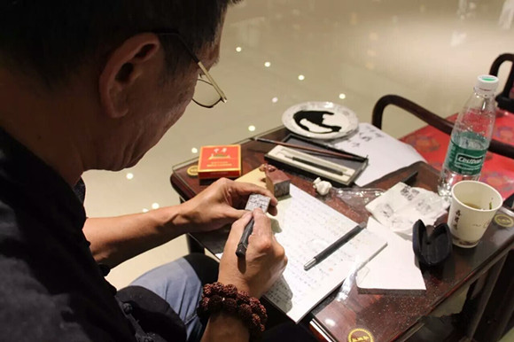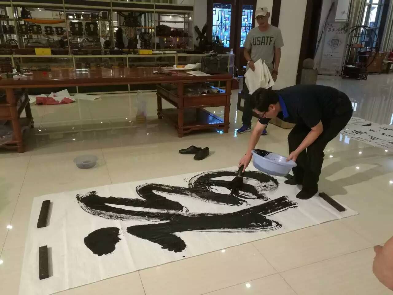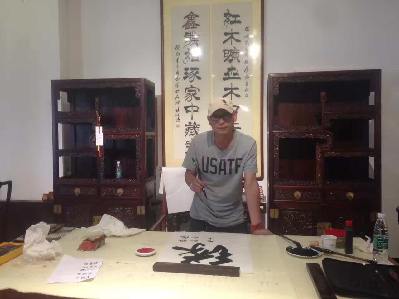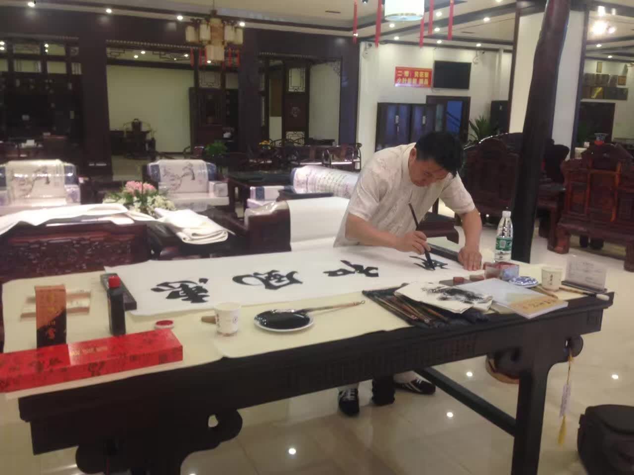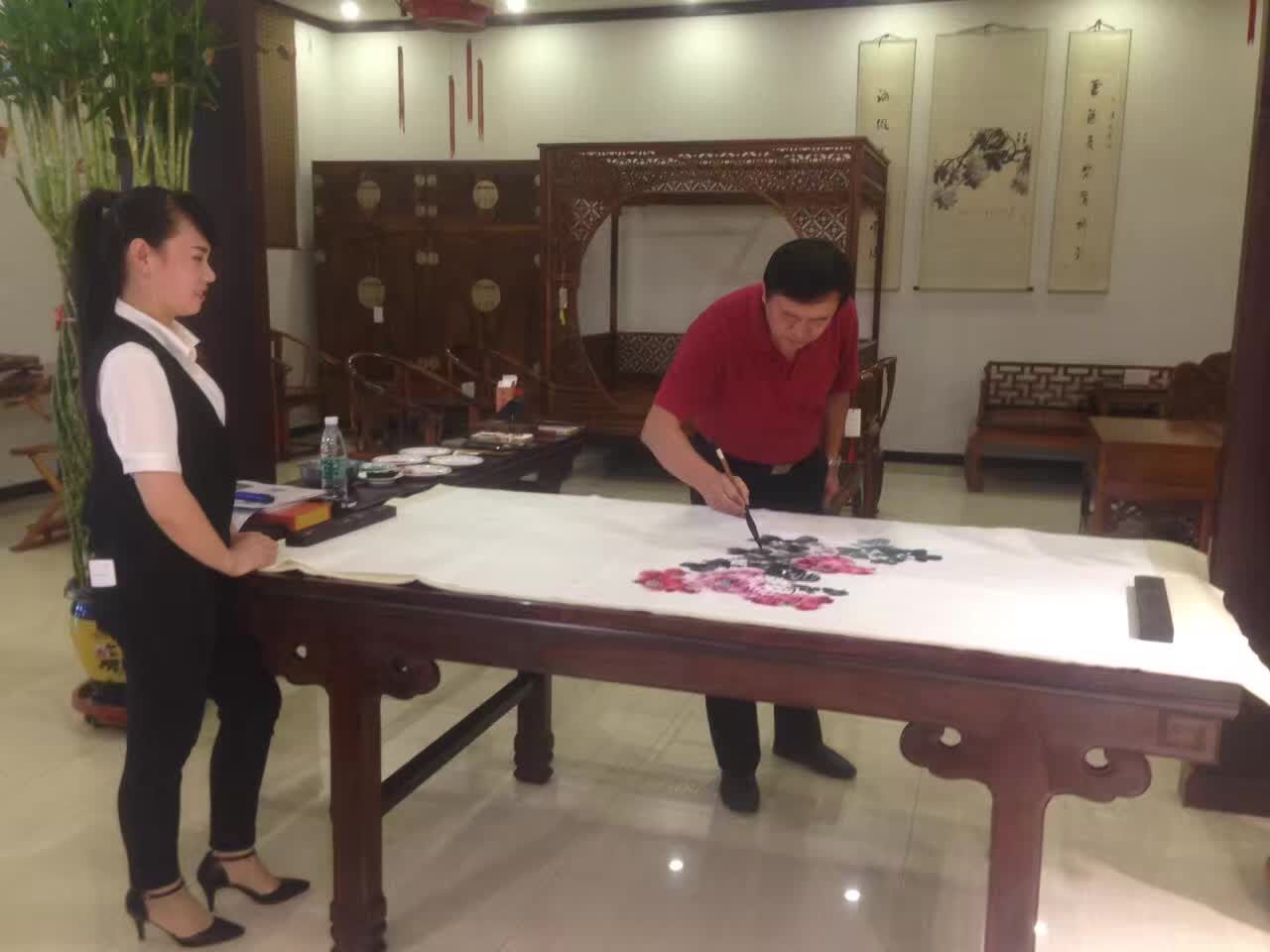 艺术家们大都向往古趣,红木为媒,书画会友。正如《兰亭集序》所描述“虽趣舍万殊,静躁不同,当其欣于所遇,暂得于己,快然自足”,大家被古朴尚美的红木家具所吸引,书画家们挥毫泼墨现场进行艺术创作。