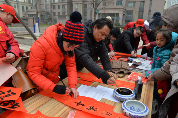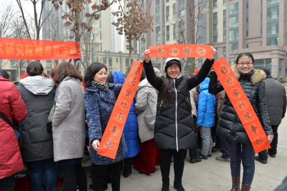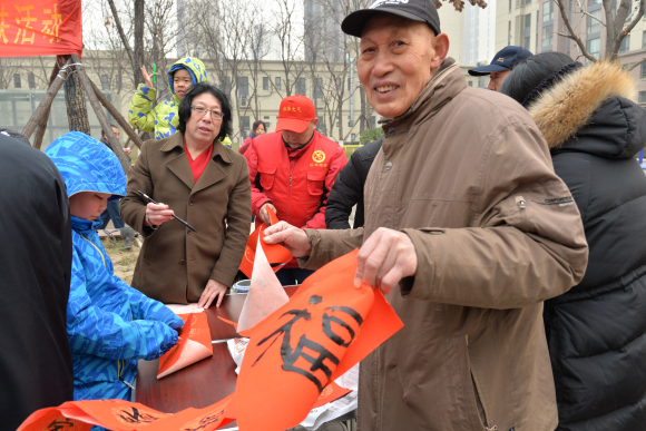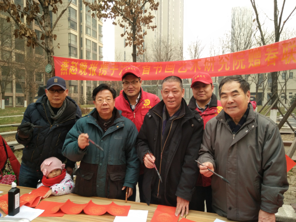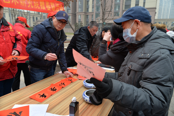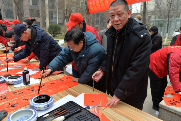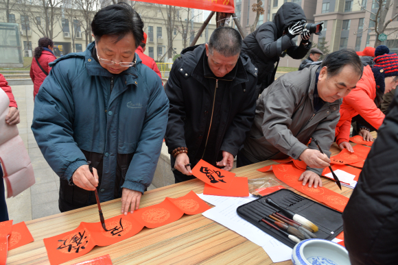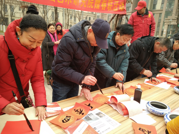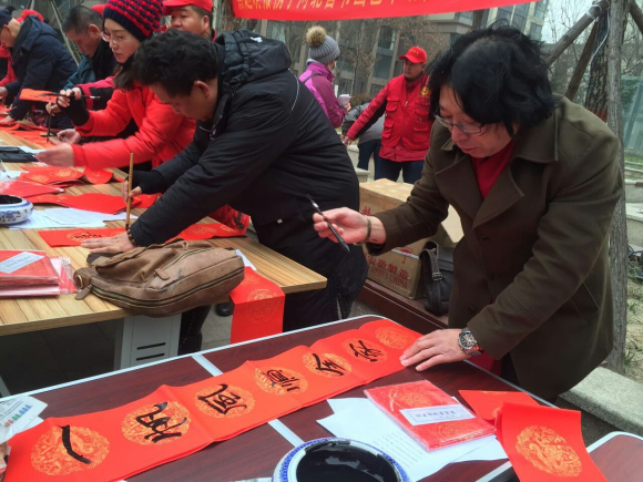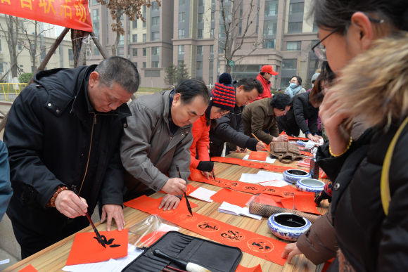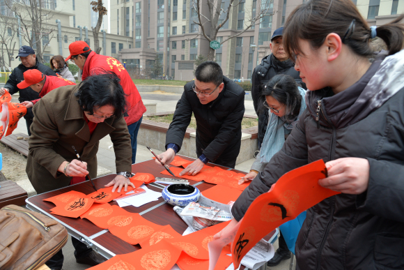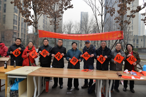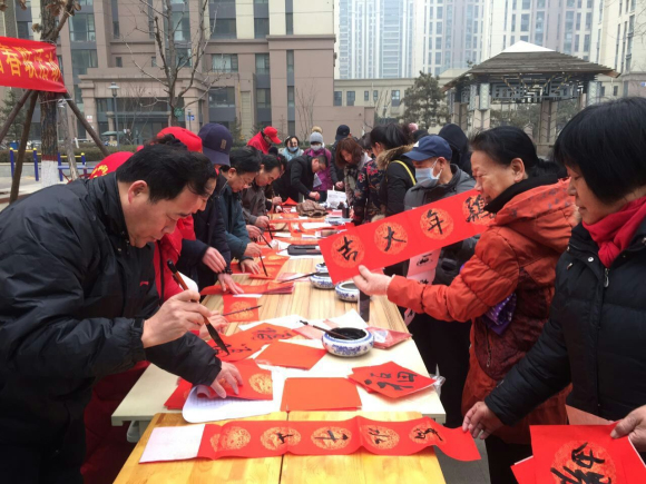 启动仪式结束后,河北省书画艺术研究院的书法家们迎着凛冽的寒风,现场挥毫为居民书写春联和福字。社区居民们早早的在广场等候,等着能让书法家们给自己写上几副春联,过年贴在家门口,红红火火过大年。书法家老师们的手冻僵了,搓搓手继续写,耐心地满足每一位居民的要求,活动一直持续到中午十二点,共写了500余春联和福字,推动了社区精神文明建设,丰富社区居民的文化生活,营造健康、热烈、喜庆、文明的节日氛围。