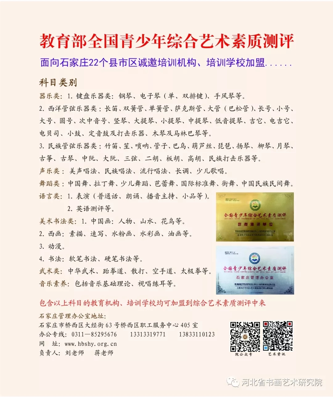 全国青少年综合艺术素质测评是专业测评考试系统;师资培训是全国青少年综合艺术素质测评工作的重要组成部分;辅导教师培训以先进的教学理念为指导,以先进的教学方法为手段,理论联系实际,注重在培训过程中培养学员的实际应用能力。提高青少年综合艺术素质水平,通过科学、规范的培训与测评,推广先进的学习理念,逐步达到对所学艺术的初知、认知,提高学习者的艺术技能和审美水平,以培养“德、智、体、美、劳”全面发展综合素质人才,开拓青少年创造力和创新能力,引导青少年向“高素质、多技能”发展,推动我国综合素质教育事业的发展为目的。