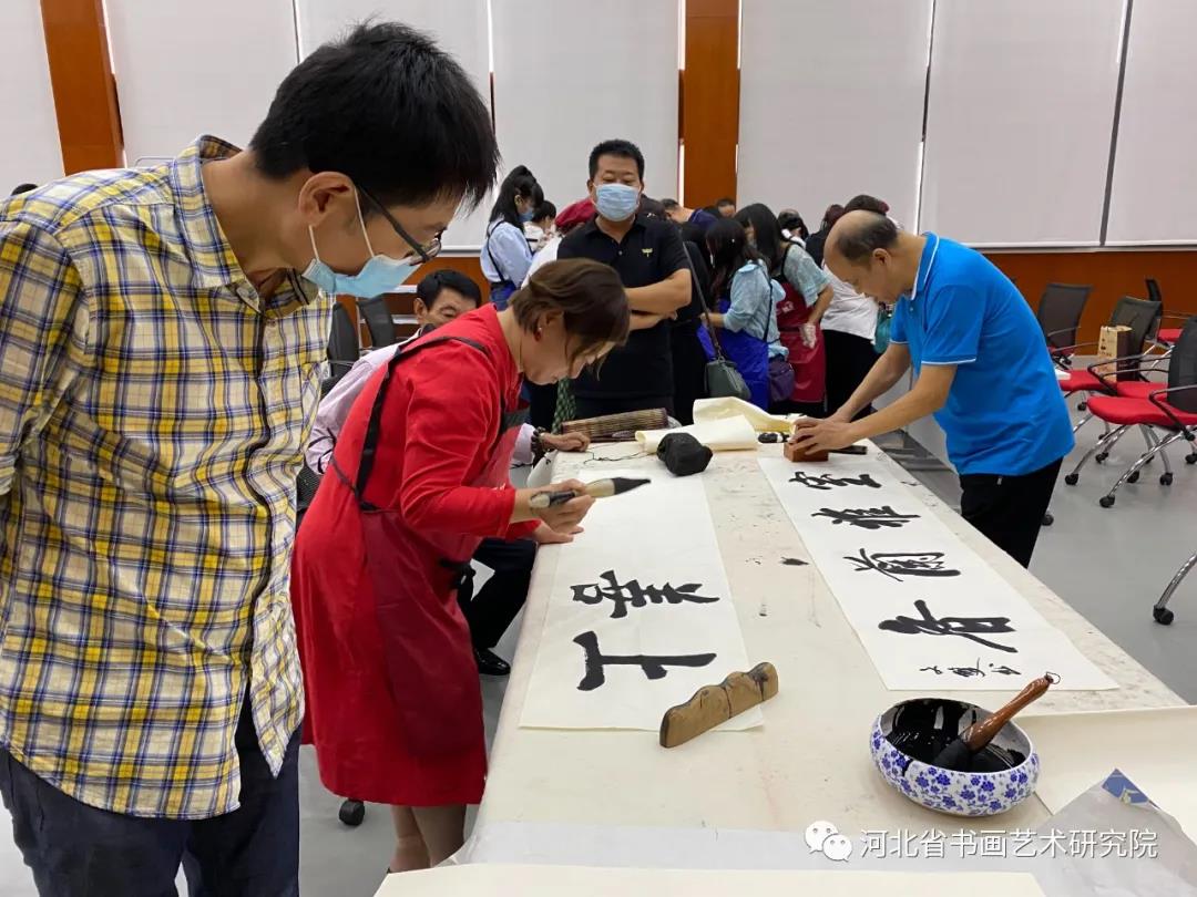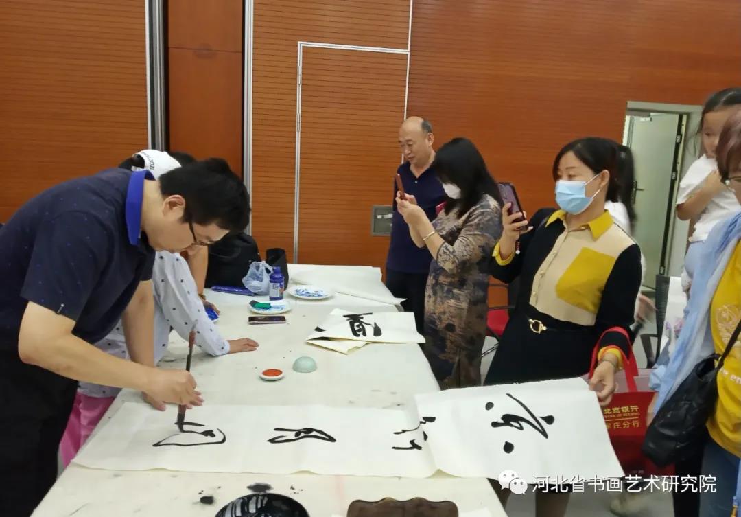 另一边书画艺术研究院的书画家们挥毫泼墨即兴创作书画作品,大家围在旁边学习欣赏着传统书画艺术,脸上洋溢着幸福的笑容。