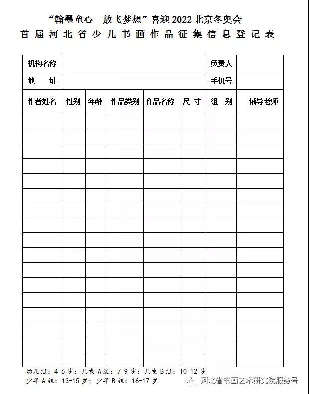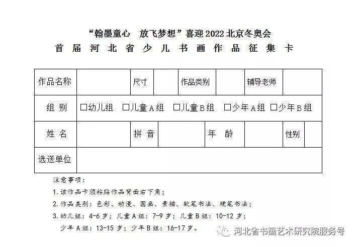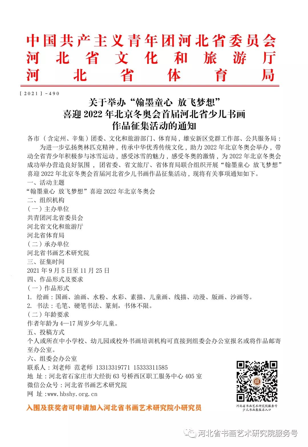 为进一步弘扬奥林匹克精神,传承中华优秀传统文化,助力2022年北京冬奥会举办,带动全省青少年积极参与冰雪运动,感受冰雪大魅力,感受冬奥的激情,为2022年北京冬奥会成功举办营造良好氛围,共青团河北省委员会、河北省文化和旅游厅、河北省体育局联合组织开展“翰墨童心 放飞梦想”喜迎2022年北京冬奥会首届河北省少儿书画作品征集活动,现将有关事宜通知如下: