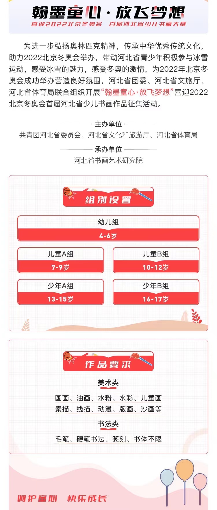 为进一步弘扬奥林匹克精神,传承中华优秀传统文化,助力2022年北京冬奥会举办,带动全省青少年积极参与冰雪运动,感受冰雪大魅力,感受冬奥的激情,为2022年北京冬奥会成功举办营造良好氛围,特联合组织开展“翰墨童心 放飞梦想”喜迎2022年北京冬奥会首届河北省少儿书画作品展活动。